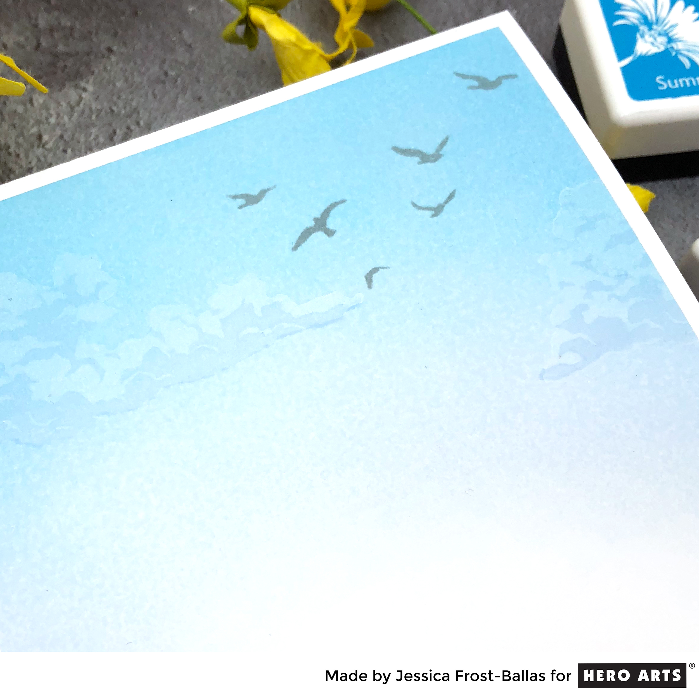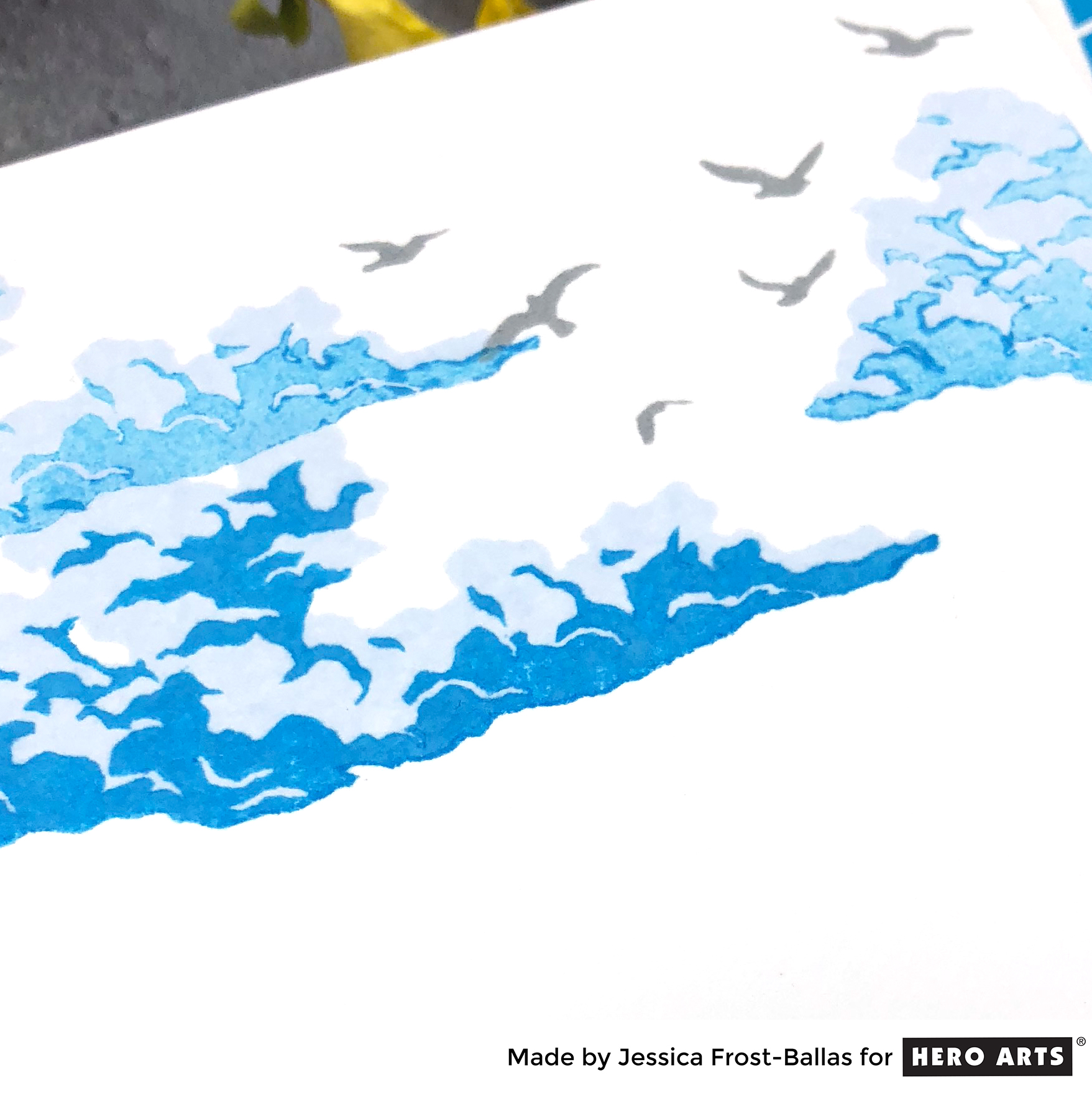 Next I stamped the solid cloud layer with white pigment ink. Then I stamped the second layer over it with soft sky ink. Finally I added the sea birds and the sentiment with soft granite ink.