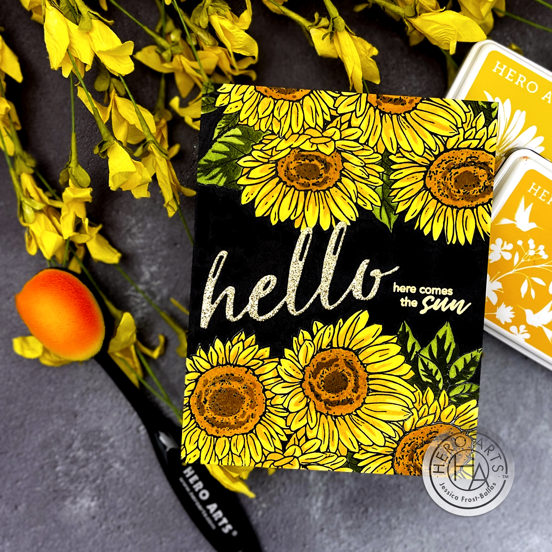 You are a genius to even conceive this card. I LOVE the black background but I would never have tried o create I using markers. I’ve only used markers to color small images…never a background. I have to TA think in out if the box! Thanks so much for the inspiration. I love this card, maybe because My favorite jumpsuit from back in the day 😂 was sunflowers on a navy background.