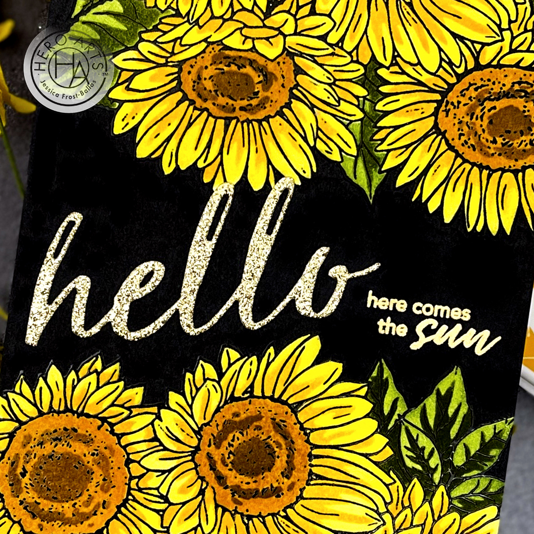 Next I took a black copic marker and colored the panel in between the two stamps to create a solid black background. Once it was totally dry I stamped part of the sentiment with embossing ink and heat-embossed it with gold embossing powder. I die-cut the ‘hello’ word from gold glitter cardstock and adhered it to the panel to complete the card!