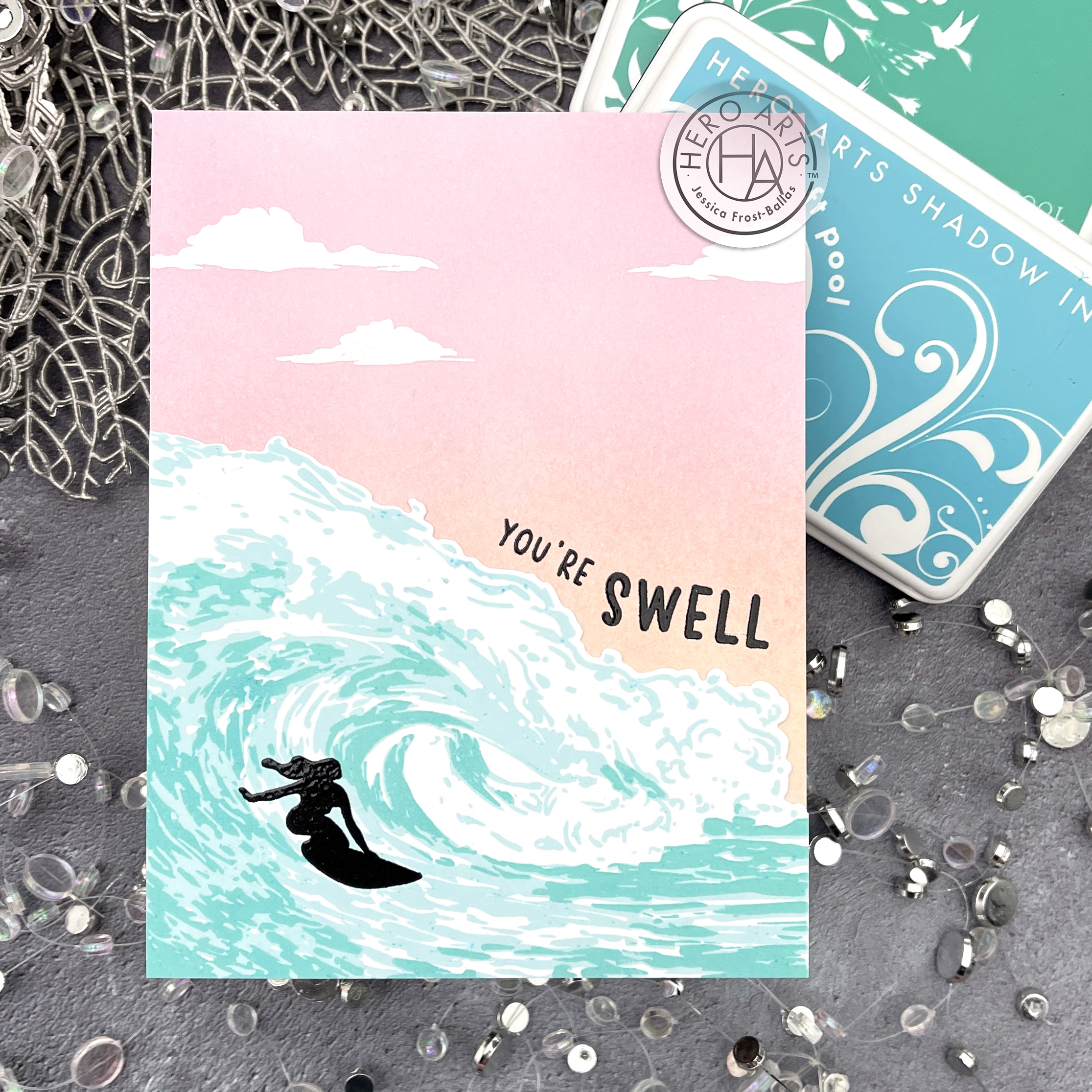 My first card features the new Color Layering Barrel Wave! I started by blending a background of Pale Tomato, Soft Canteloupe, and Butter Bar ink. Then I stamped the layers of the wave in Tide Pool and Soft Pool ink and die cut it with the coordinating die. I curved the sentiment from the set around the wave and stamped it onto the background with versafine and heat-embossed it with clear embossing powder. I finished the card by adding the surfing girl heat-embossed with clear embossing powder.