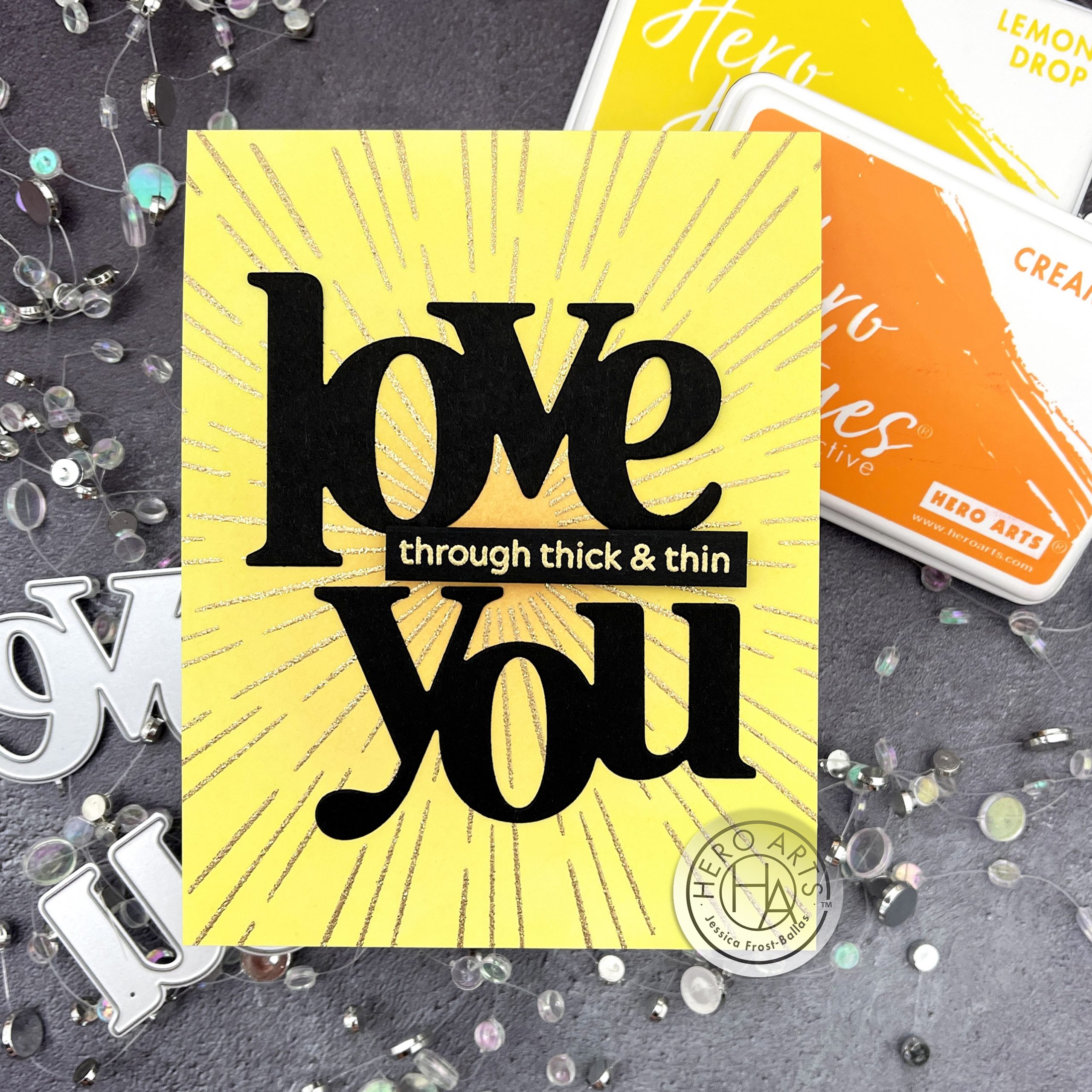 My second card features more ink blending the the fun Sunray background cling stamp! I started by blending lemon drop and creamsicle reactive ink onto an a2 panel. Then I stamped the Sunray cling stamp with embossing ink and heat-embossed it with gold glitter embossing powder. Finally I added a sentiment from the Love You stamp and cut XL and the new Message Strips stamp and cut to finish the card!