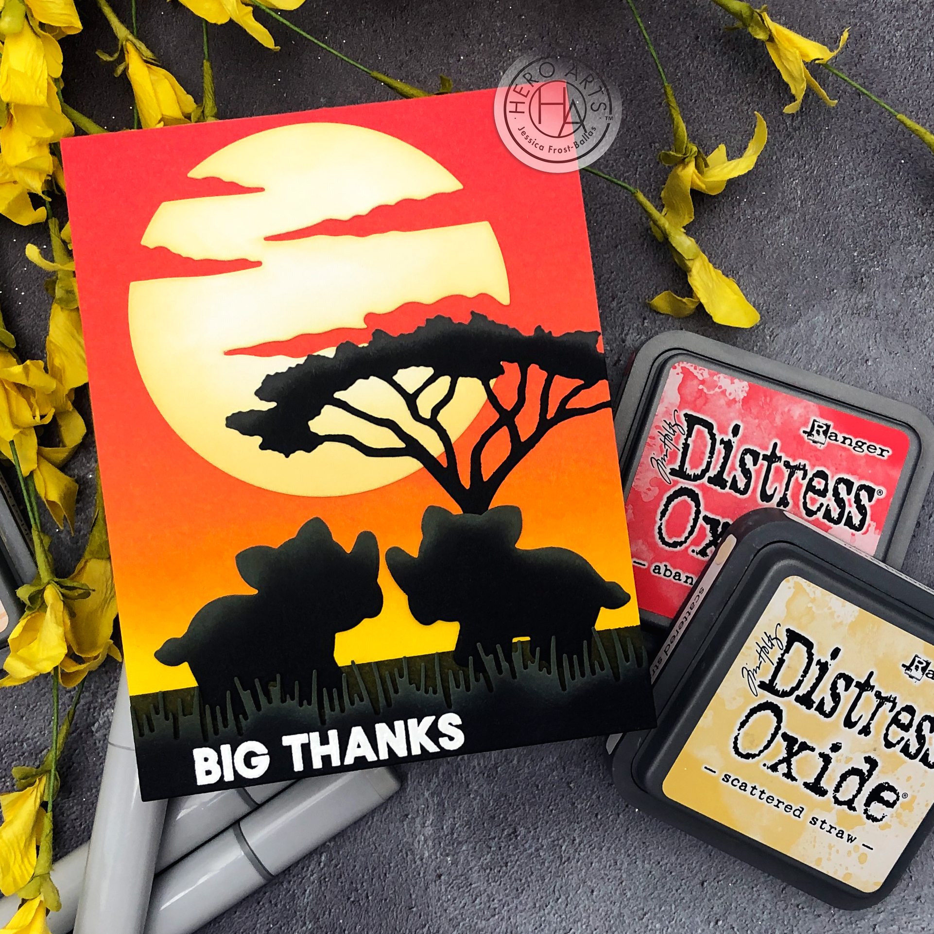 To start I blended a panel of strathmore bristol cardstock with mustard seed, ripe persimmon, and festive berries distress oxide ink. I masked off about an inch from the bottom of the panel and blended black soot distress oxide ink over the bottom. Then I die-cut the Safari Sunset with bristol cardstock and blended scattered straw distress oxide ink over the edges. Next I die-cut the rhino pair from Big Thanks and the Thorn Tree and Grass from Hero Arts with black cardstock. I blended a little unicorn white pigment ink on the tops of the dies and then added a little mustard seed distress oxide ink to create the look of sunlight on the silhouettes.