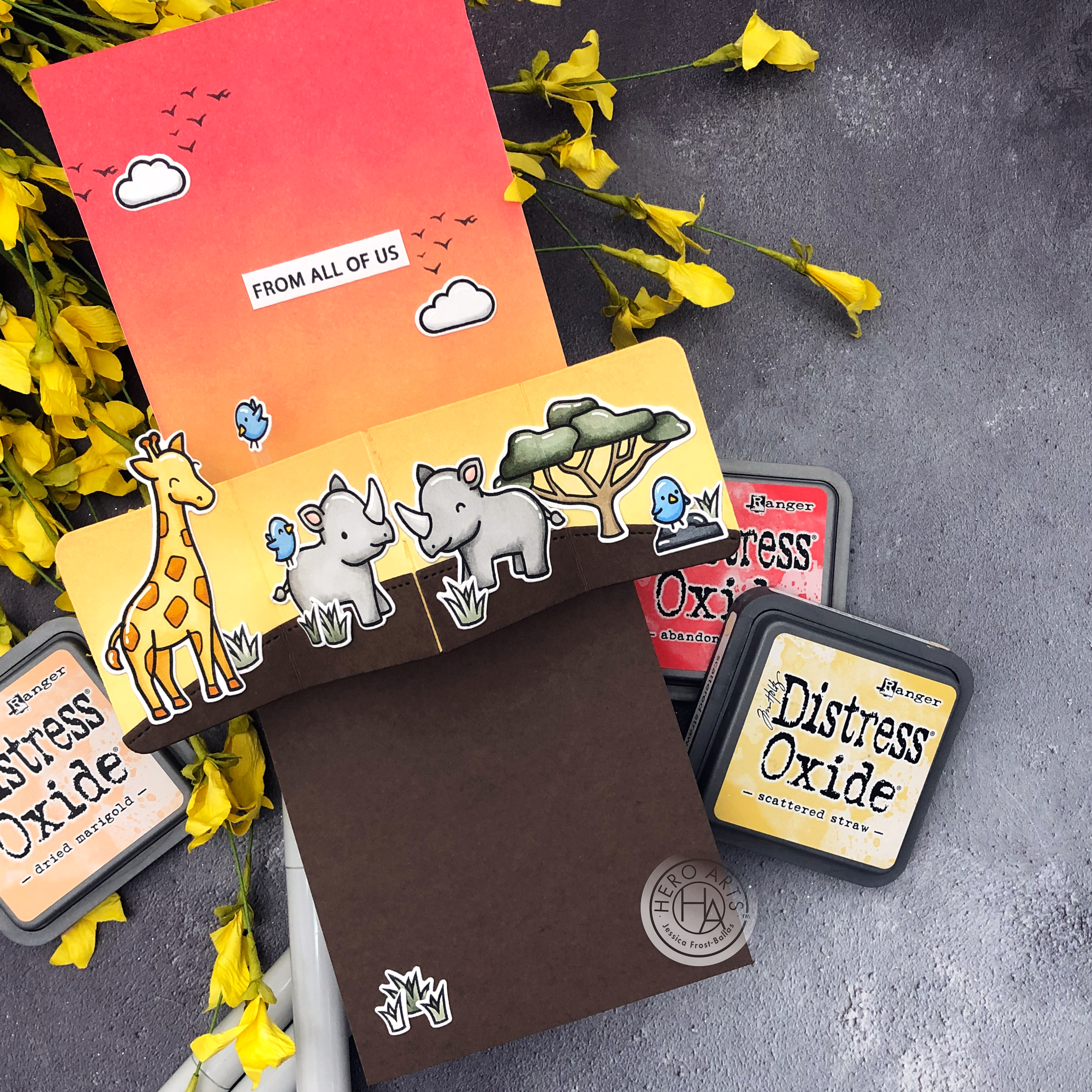 I stamped critters from Big Thanks and Critters on the Savanna with intens-ified copic-friendly black ink and colored them with copic markers before die-cutting them with the coordinating dies. I assembled my pivot mechanism and then I added the critters to my scene, including a little acetate strip for one of my birds. I also stamped a few birds from the Hero Arts Wild About You set onto the top panel and added the rest of the sentiment from Big Thanks. To finish the card I added a few accents with a white gel pen!