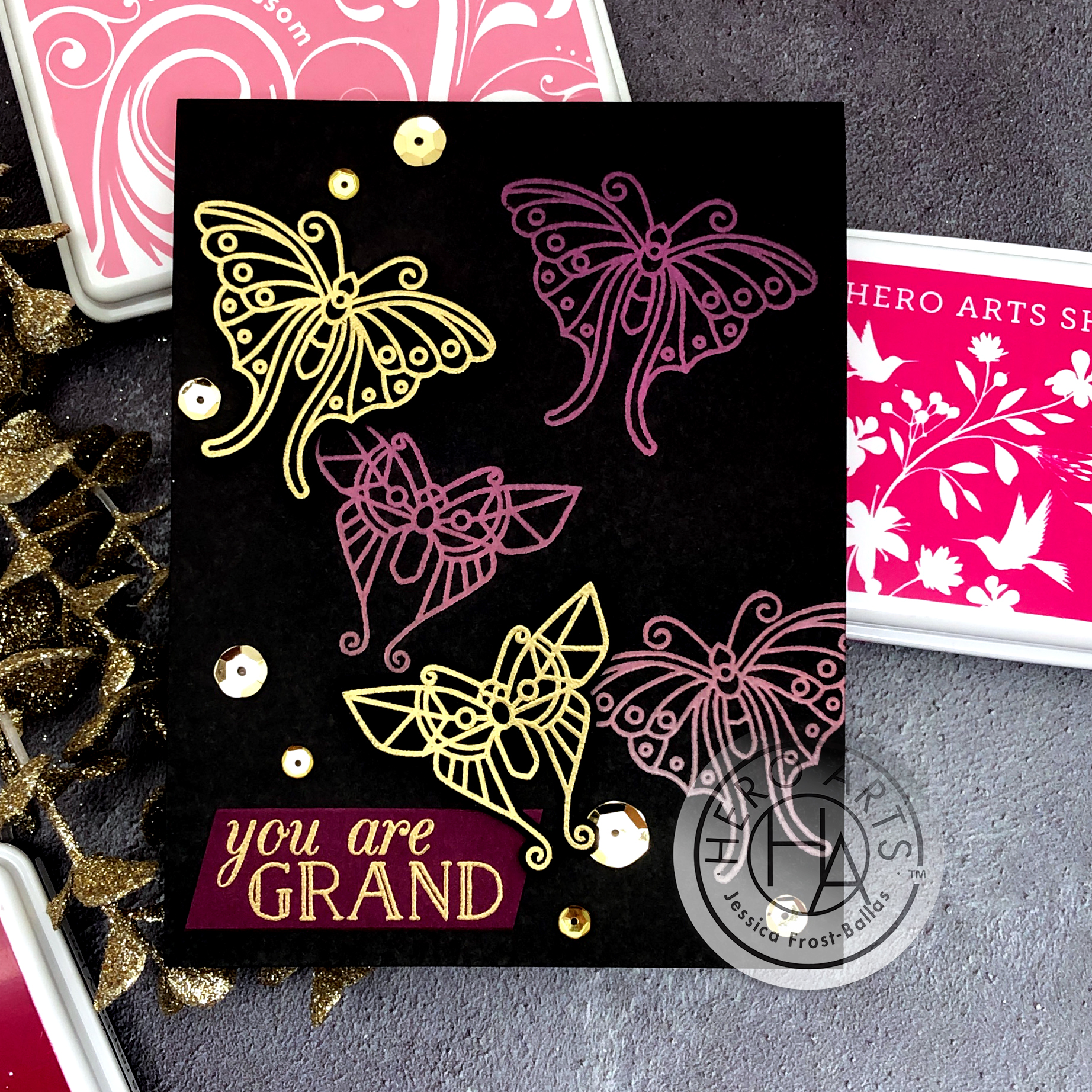 To start I blended Soft Blossom, Ultra Pink, and Raspberry Jam ink across a panel of strathmore bristol cardstock. Then I stamped the two butterflies from Deco-Rations three times on the panel and heat-embossed them with clear embossing powder. While I had the stamps out I also stamped the butterflies onto black cardstock, heat-embossed them with gold embossing powder, and die-cut them with the coordinating dies. Then I said a quick prayer and swiped my black ink pad across the entire panel until it was totally covered. I took a soft cloth and rubbed the black ink off of the embossed butterflies revealing the pretty ink blending below. I love using the Joseph’s Coat technique but it’s always a little scary to cover everything with the black ink!!