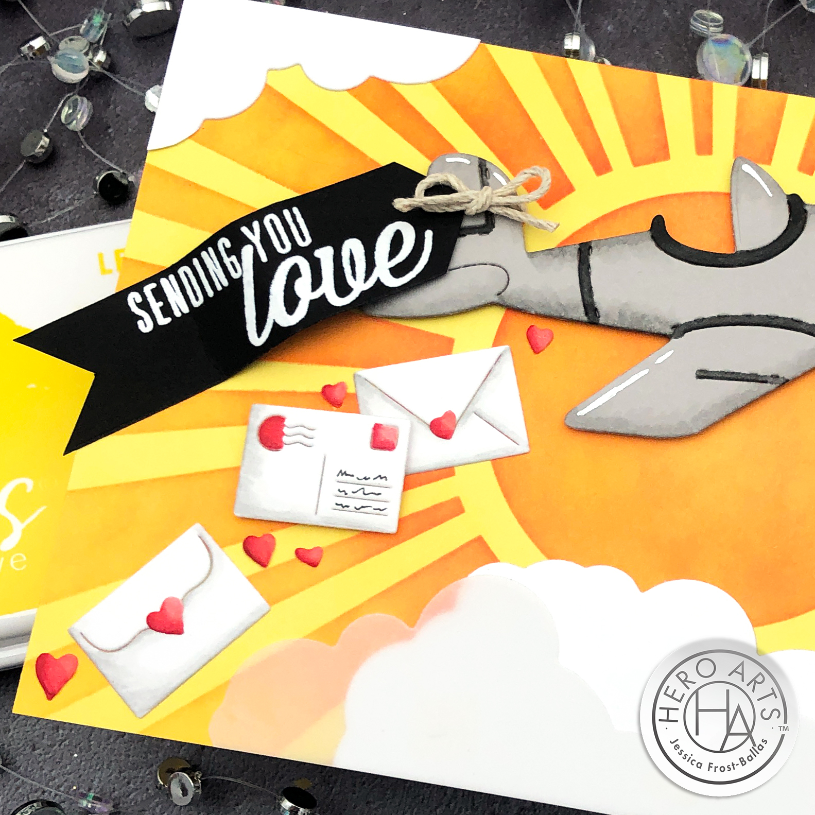 Next I die-cut the Airplane Fancy die and envelopes from US Mailbox Fancy die and colored them with copic markers. I also die-cut hearts from the Heart Tree Stamp & Cut and colored them with copic markers. I added a few to the back of the envelopes and saved the rest for the card. I stamped a sentiment from the kit onto a piece of Pitch Black cardstock and heat-embossed it with white embossing powder. I trimmed it down to a banner and tied it to the airplane with a little natural twine. I die-cut clouds from the Cloudy Sky Scene die set with white cardstock and vellum and adhered it around my stenciled panel. Then I added my airplane with foam mounting tape. I used my finger to carefully curve the sentiment to give it a little dimension and then adhered it to the panel. Finally I added my cascading envelopes and hearts to finish the card!