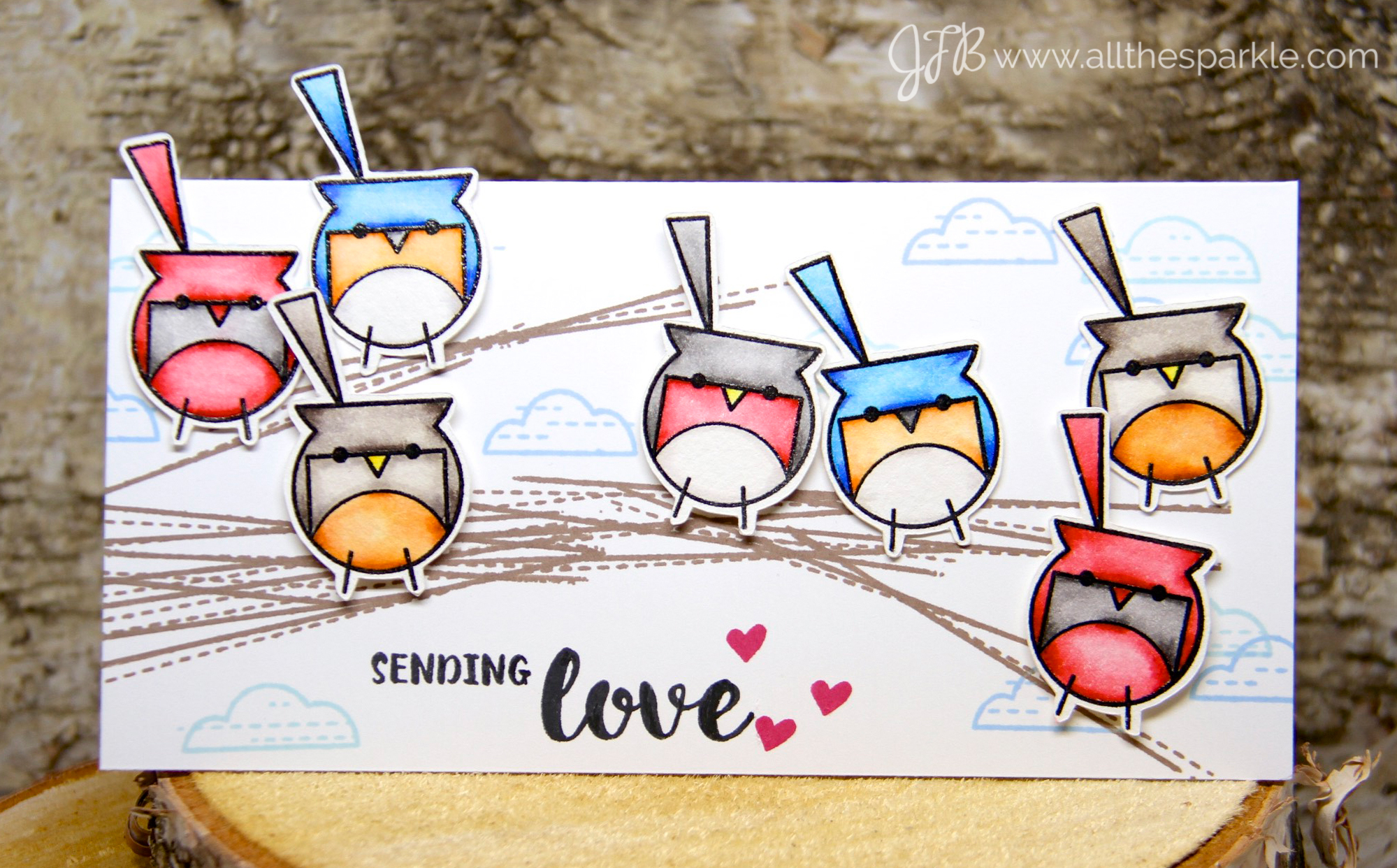 I love the modern artsy look of the birds and all of the accessory stamps in the set. I decided to use the long dashed/solid line stamp and Coconut Husk ink from WPlus9 to create a branch for my flock of birds to perch on. I stamped the clouds with Lake House and Bo Peep ink and stamped the hearts with Sweet Gelato ink. The sentiment is from the That is All stamp set and I masked off the ‘d’ in the large word ‘loved’ to create my sentiment. Then it was time to add my birds!!