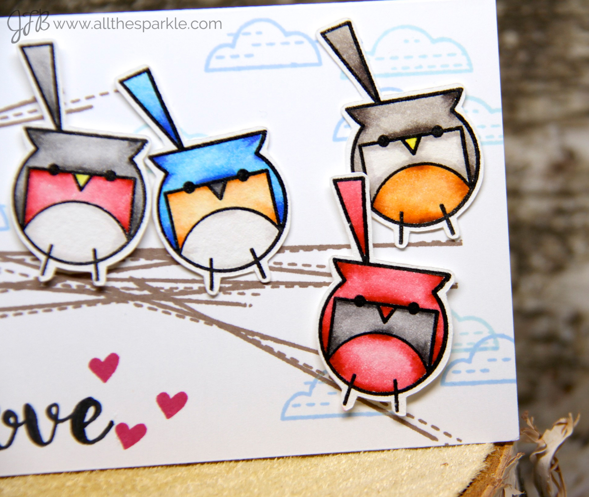 I adhered some of the birds with my ATG gun and some with foam mounting tape for a little dimension and that’s it! Seriously though, if you like cute critters I can’t recommend this set enough! It’s so much fun to color!