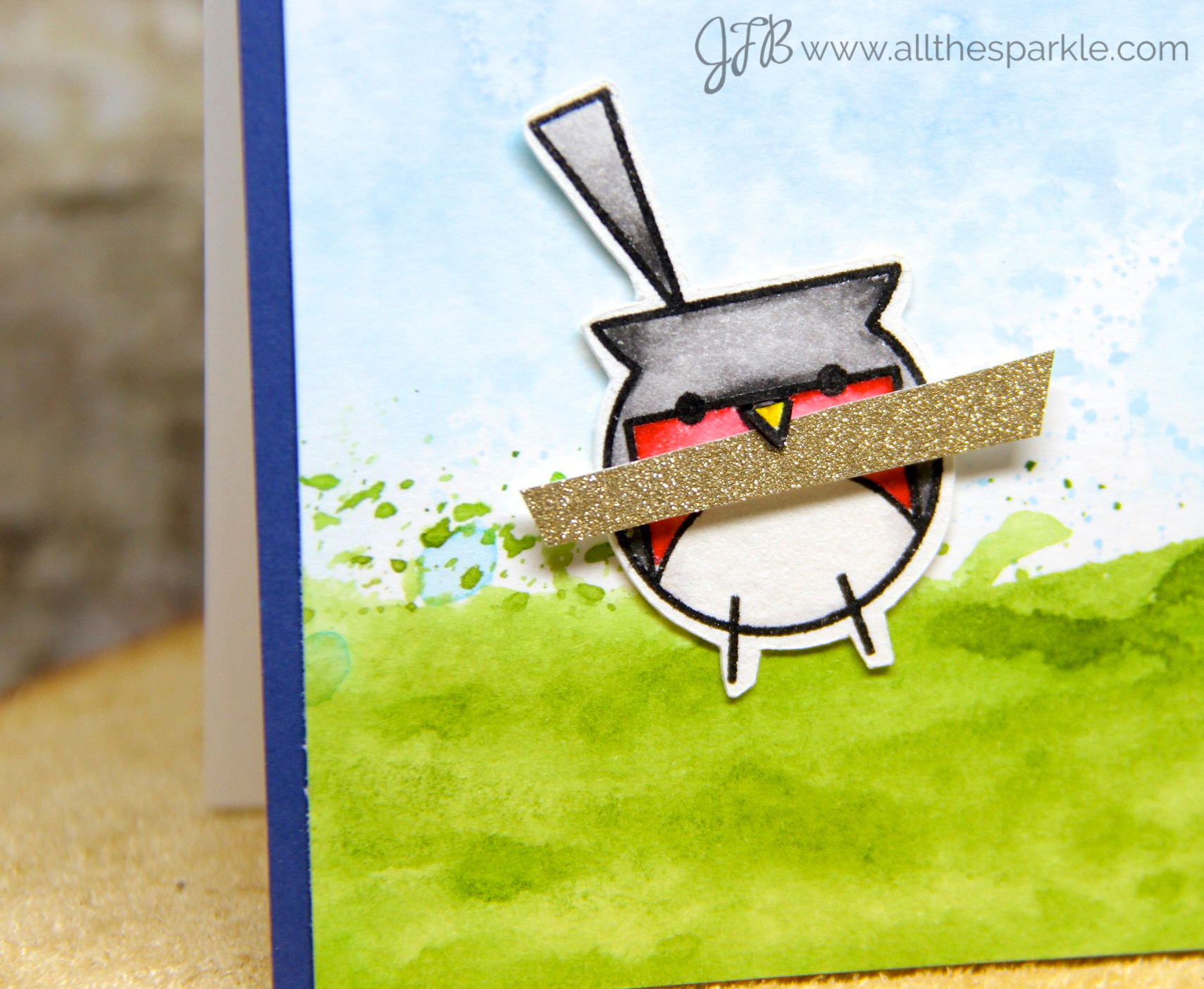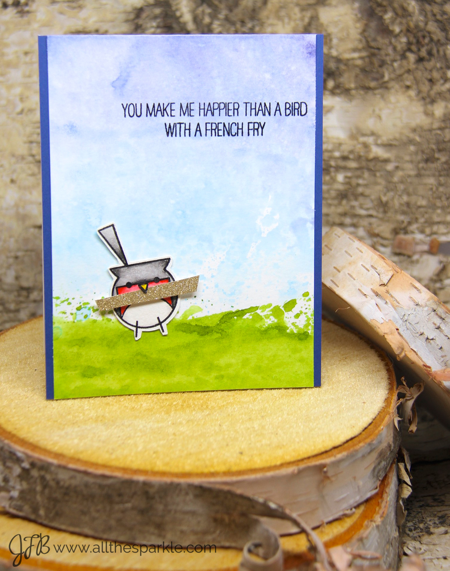 Once it was dry I added my rose-breasted grosbeak. I fussy cut the french fry from glitter paper and popped it up with foam mounting tape. I took one of the birds that hadn’t stamped cleanly and cut out his beak. I colored the beak and adhered it over the french fry so it would look like the bird was holding the french fry in his mouth. To finish the card I stamped the sentiment, trimmed the watercolor panel down on the sides, and mounted it to a blue cardstock base.