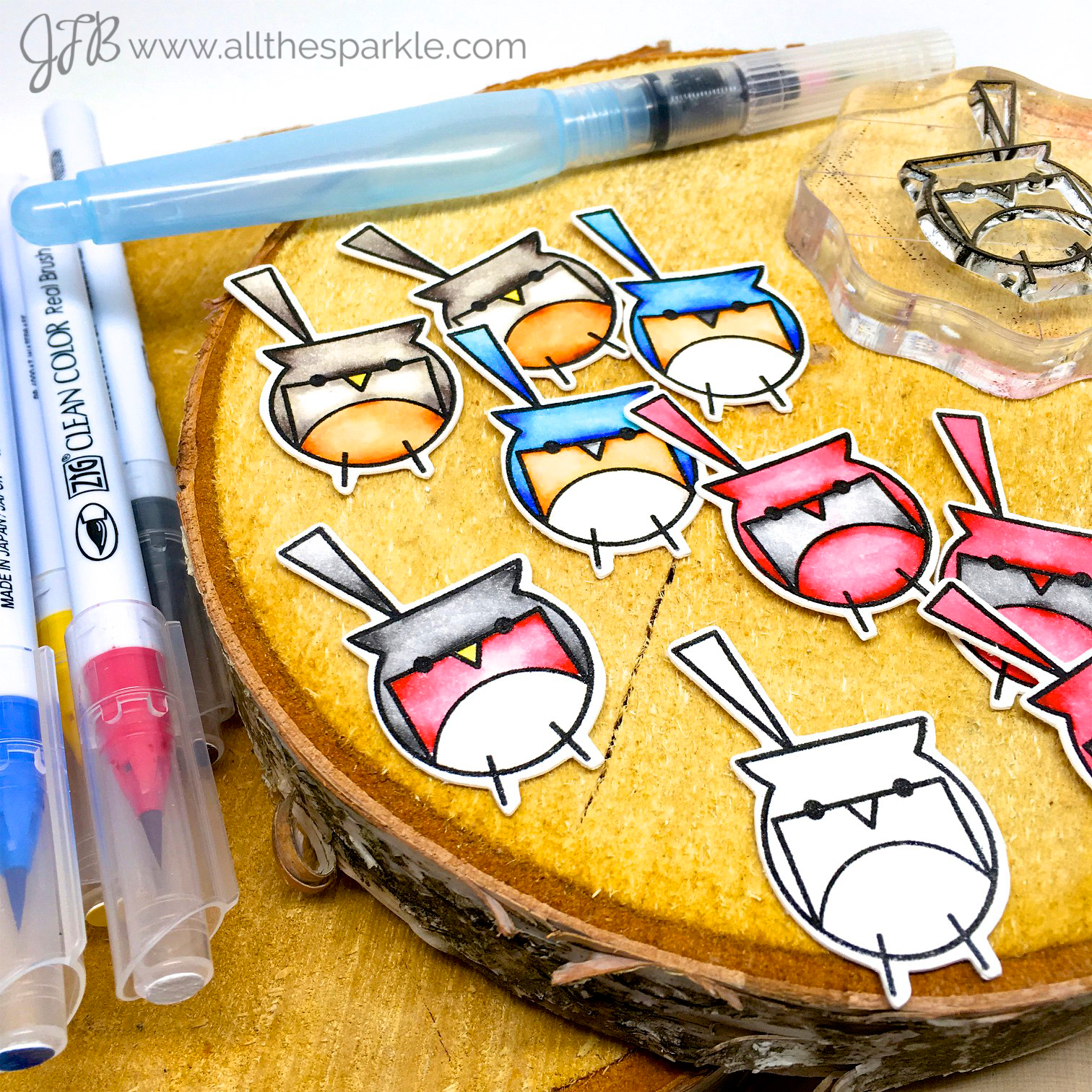 I stamped the birds on Arches cold press 140lb watercolor paper with versafine ink and heat-embossed them with clear powder. I colored them with zig clean color real brush markers and a medium aquash waterbrush and then cut them out with my Scan N Cut! I colored 30 of these birds so I had quite a stash to play with!
