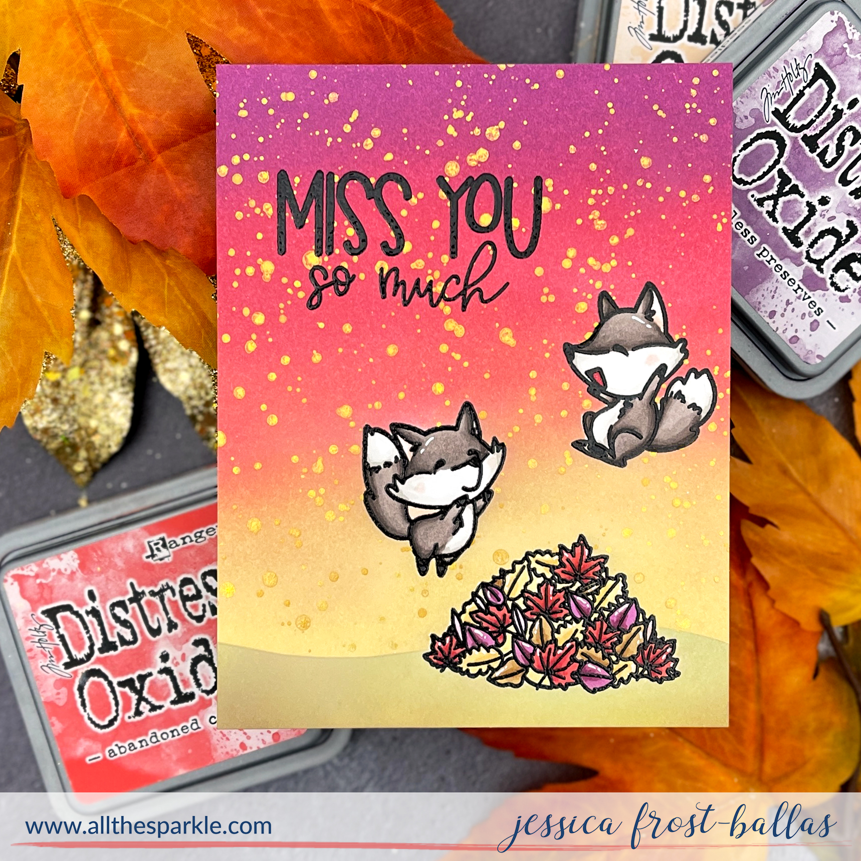 I stamped the foxes and leaf pile from Foxy Fall and a sentiment from Cute Script and masked off the foxes. Then I blended a ground with old paper and bundled sage distress oxide ink and a sky with squeezed lemonade, dried marigold, abandoned coral, and seedless preserves distress oxide ink. While the masks were still in place I splattered the panel with metallic gold and brass paint and let it dry.