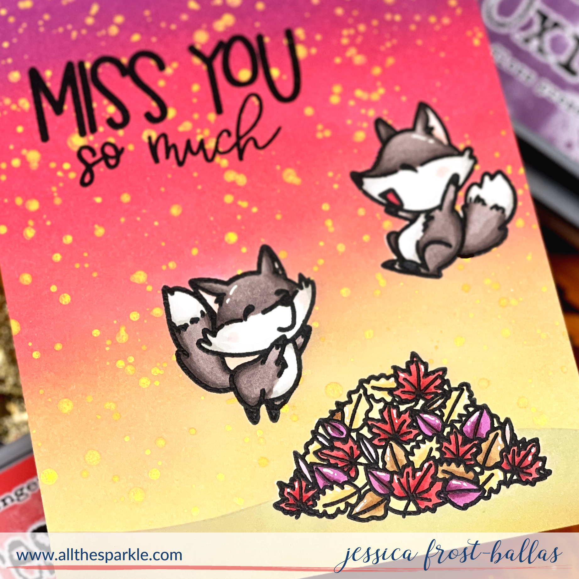 Once the background was dry I removed the masks and colored everything with copic markers. I used markers that matched closely with my blended background and my favorite E70 shades for the foxes. Finally I added a few accents with a white gel pen to finish the card. And that’s it! Simple but vibrant and perfect for fall!