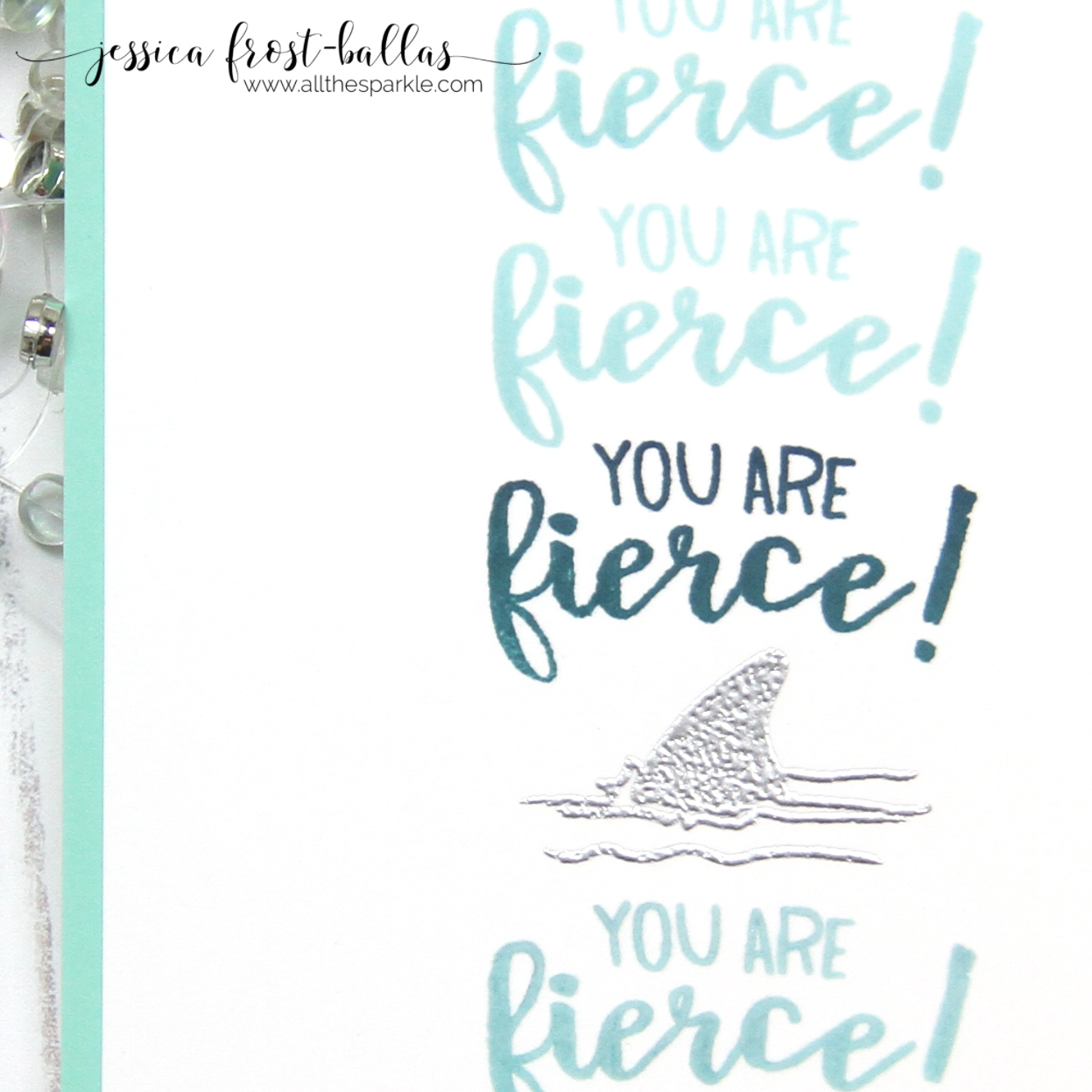 I wanted to keep it CAS and just focus on the fun sentiments and images from Hero Arts’ Killer Messages. I started by stamping the shark with versamark and heat-embossing him with silver embossing powder. Then I lined up the sentiment in the middle of my card panel and stamped it with the darker shades of the pool to navy ombre ink pad. Then I used my MISTI to stamp the sentiment in a vertical line using soft pool ink. I trimmed a quarter inch off each side of the panel and adhered it to Pool Layering Paper!