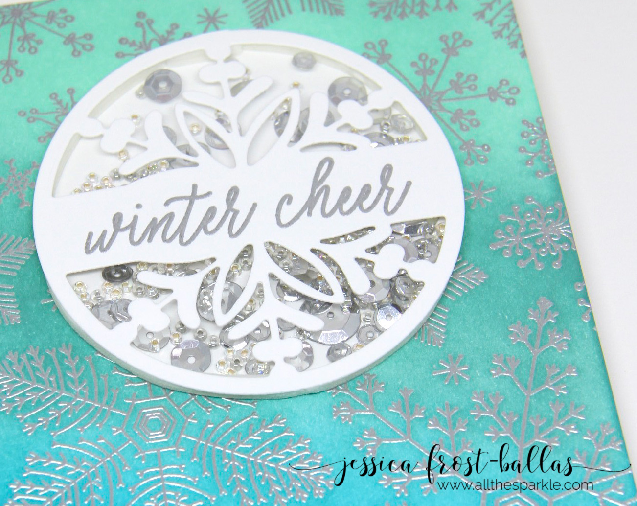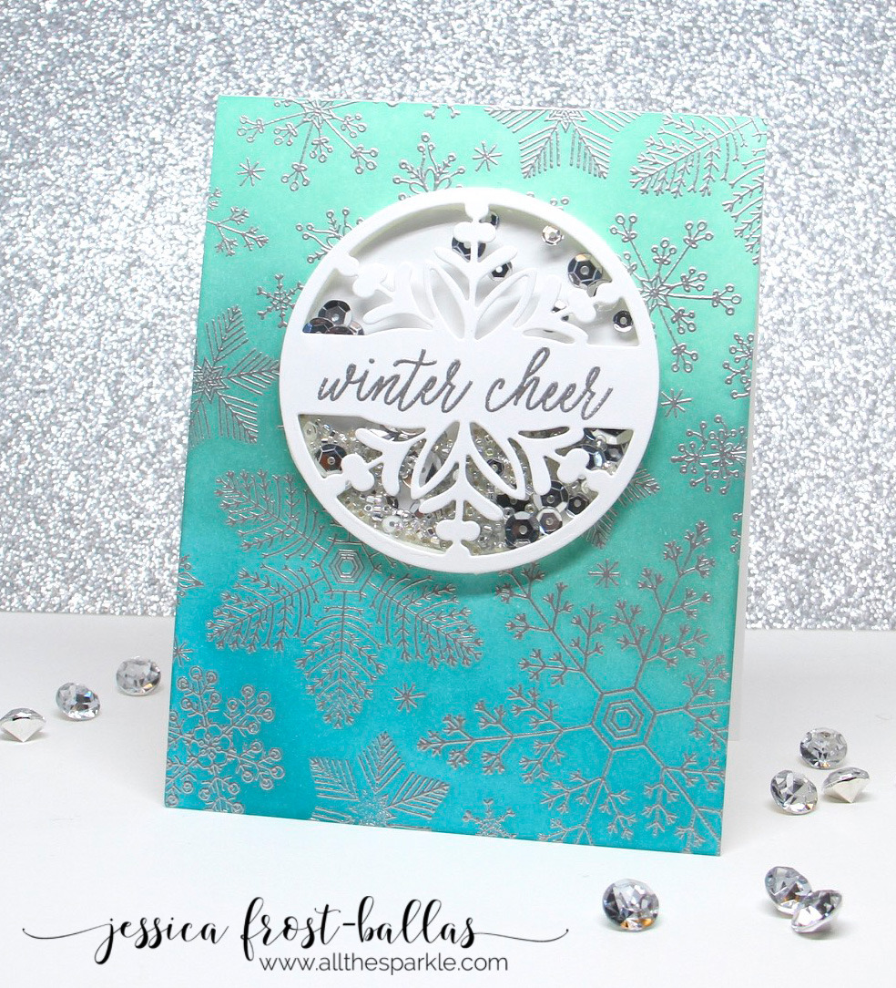 Next I stamped the same snowflake background stamp onto white cardstock and heat-embossed it with silver embossing powder. Then I blended Cracked Pistachio, Evergreen Bough, and Peacock Feathers distress ink over the background. I adhered the distress inked background to a white card base and then adhered the shaker over it. I am really becoming fond of nontraditional colors for Christmas cards and I love the sparkle and shimmer from the embossing powder and shaker!