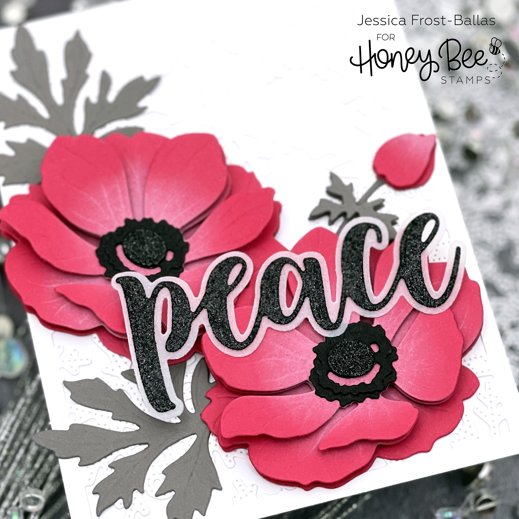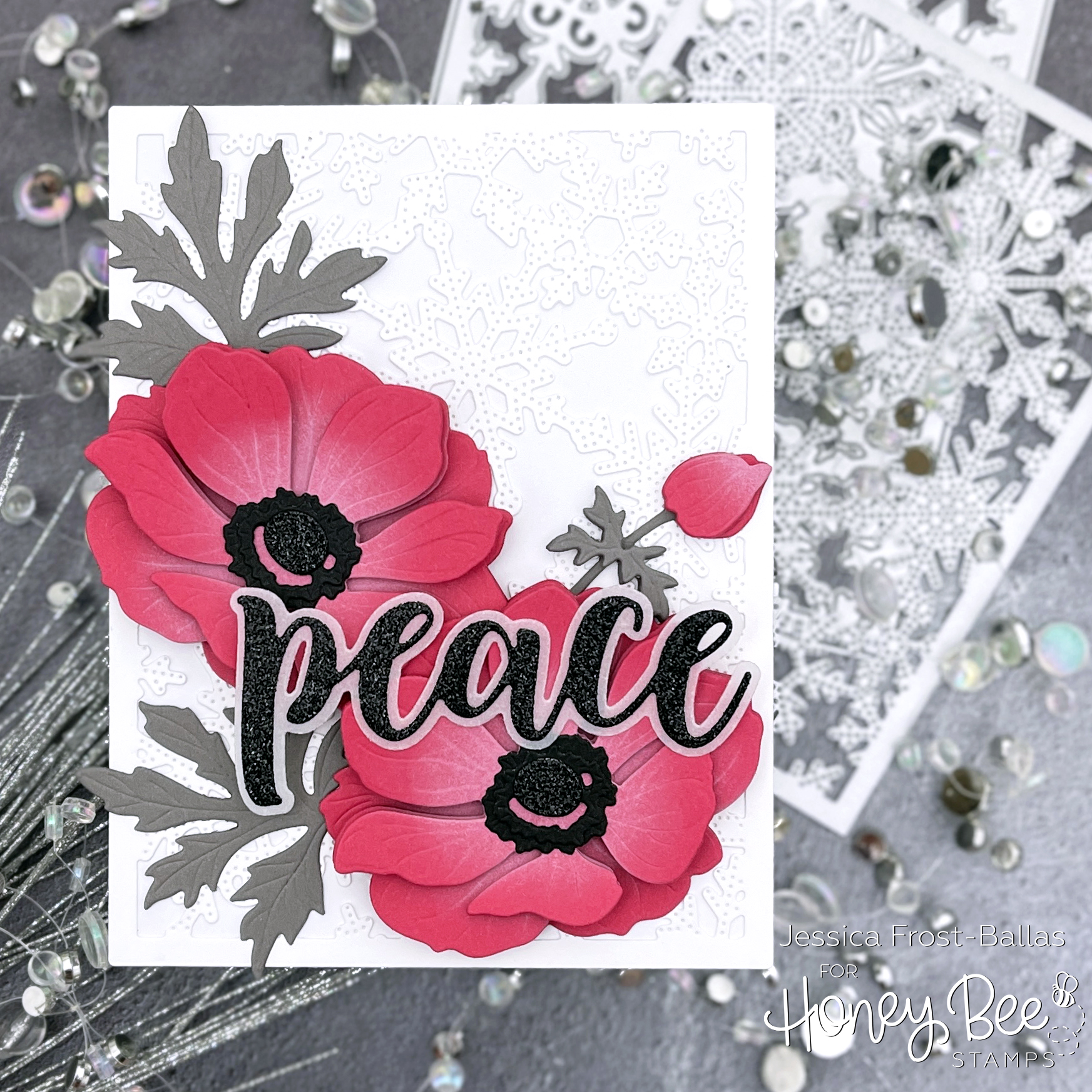 Then I die-cut the Pierced Fancy Flakes and Fancy Flakes A2 Cover Plate die from white cardstock and adhered it to a white card base. I die-cut the Peace Buzzword from black glitter and vellum cardstock and layered them together. Finally I adhered the flower and foliage with atg adhesive and added the sentiment on top!