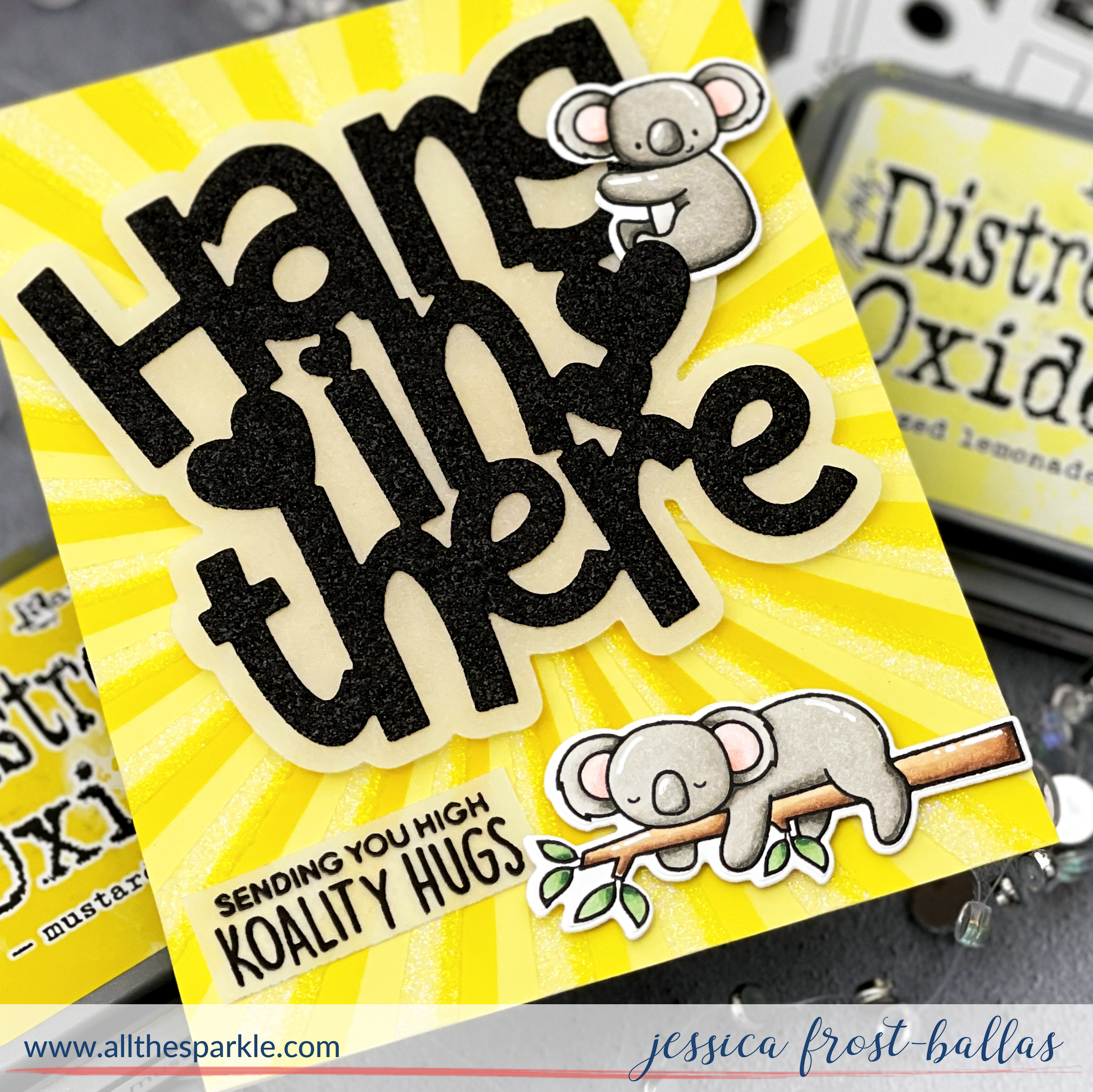 To start I stamped the adorable koalas from Koality Hugs and colored them with copics before die-cutting them with the coordinating dies. I placed the Simple Sunburst stencil over a panel of light yellow cardstock and blended mustard seed and squeezed lemonade distress oxide ink over the stencil. Then I set the ink with my heat gun. Next I rotated the stencil slightly so that a little bit of the ink blended area was exposed and taped it in place. Then I applied a thin layer of glitter paste over the stencil and let it dry completely!
