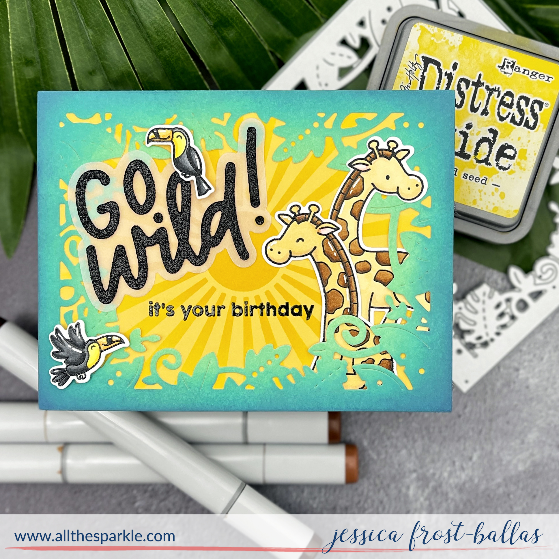 For my second card I started by die-cutting the Go Wild Frame from distress heavystock cardstock. Then I blended cracked pistachio, peacock feathers, and chipped sapphire distress oxide ink onto the panel. Next I used the same Simple Sunburst stencil and blended mustard seed distress oxide ink over the stencil on a panel of darker yellow cardstock. I set both panels aside to dry while I stamped and colored the images from Two by Two Safari Animals.