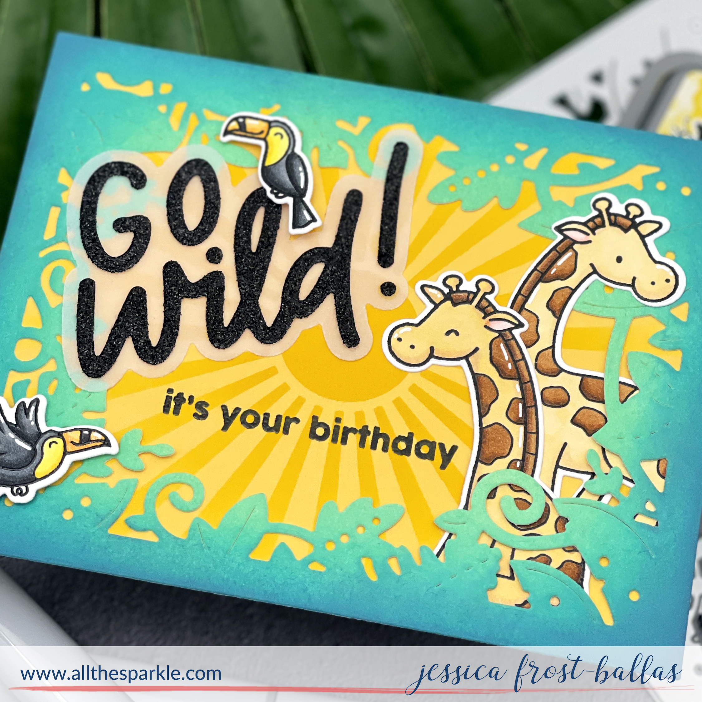 Once the panels were dry I stamped part of the sentiment from Wild at Heart Sentiments onto the stenciled panel and heat-embossed it with black embossing powder. I die-cut the Go Wild sentiment from the same combination of black glitter cardstock and vellum. I adhered the Go Wild panel to my stenciled background and tucked my sentiment and animals in and around the frame with a mix of foam mounting tape and regular adhesive. I finished the card with a little spectrum noir clear sparkle and white gel pen accents!