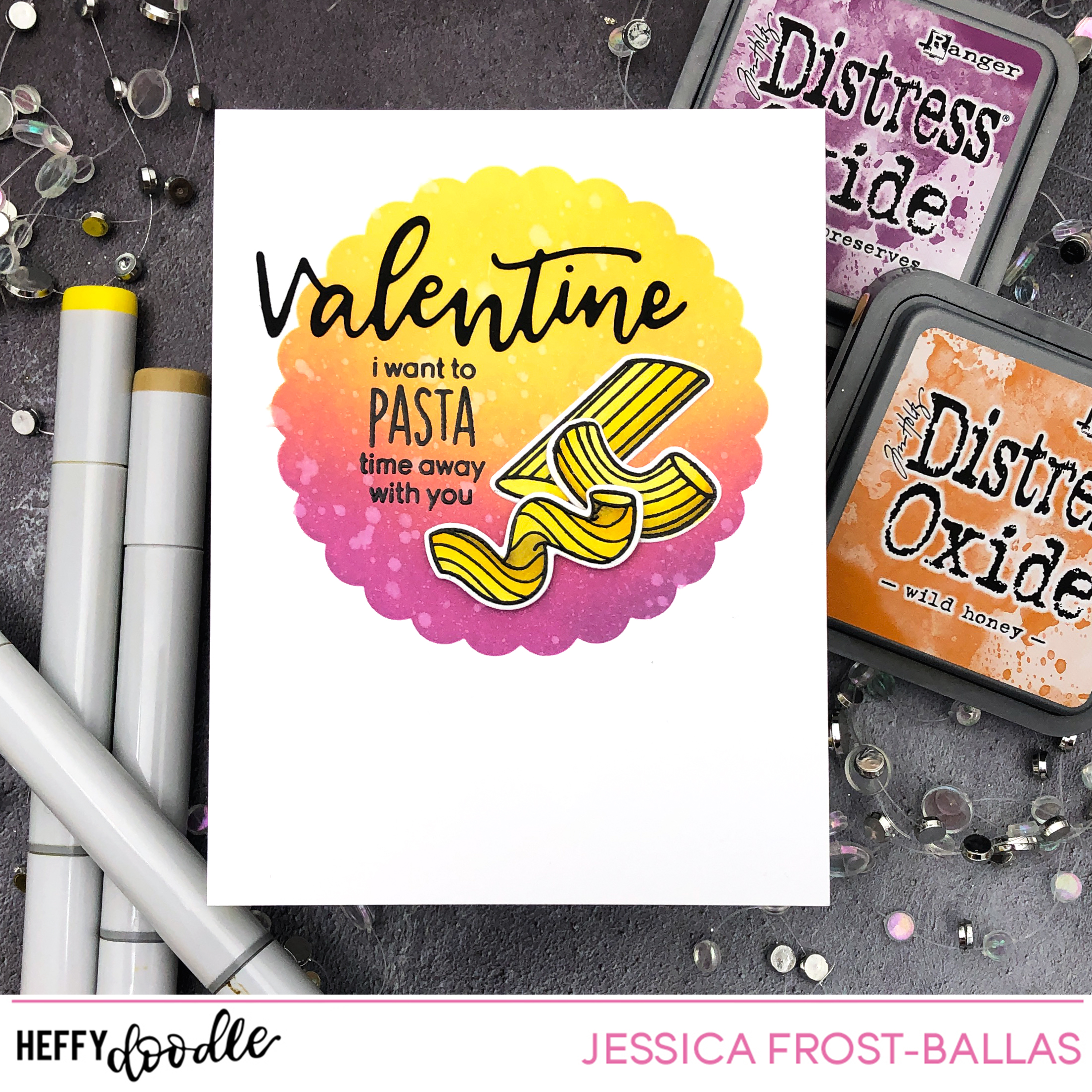 Next I temporarily adhered the new Scalloped Circle Masquerade Stencil to an A2 panel of white cardstock and blended it with distress oxide inks in Squeezed Lemonade, Dried Marigold, and Seedless Preserves. I splattered it with water and then removed the stencil and let it dry. Once it was totally dry I stamped the sentiment from Pasta La Vista with versafine and heat-embossed it with clear embossing powder. I also die-cut the Valentine word from black cardstock and adhered it to the panel. Finally I added my pasta with a mix of regular adhesive and foam mounting tape! I think it’ll be a fun and quirky Valentine’s card for my husband this year! 🙂