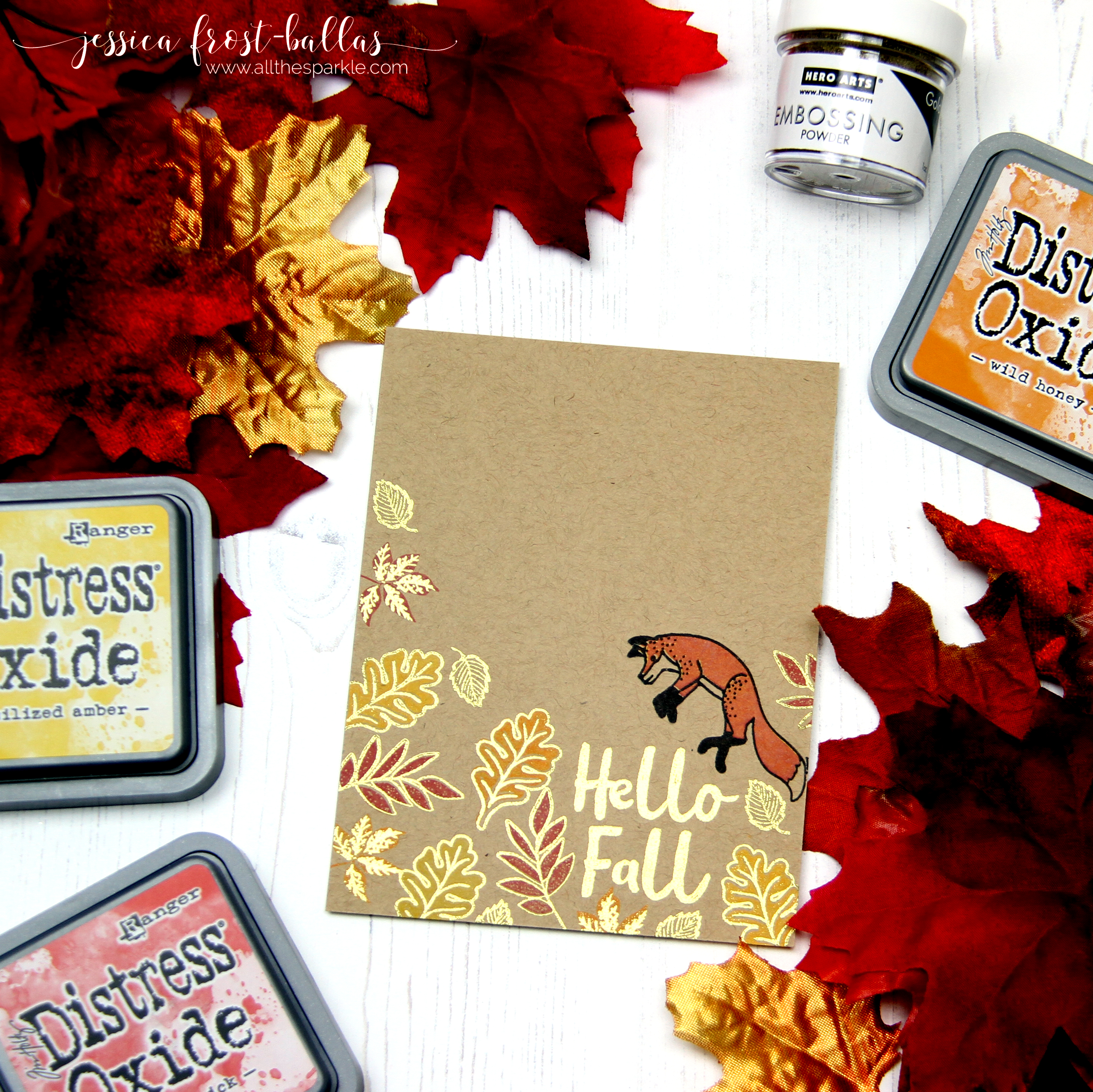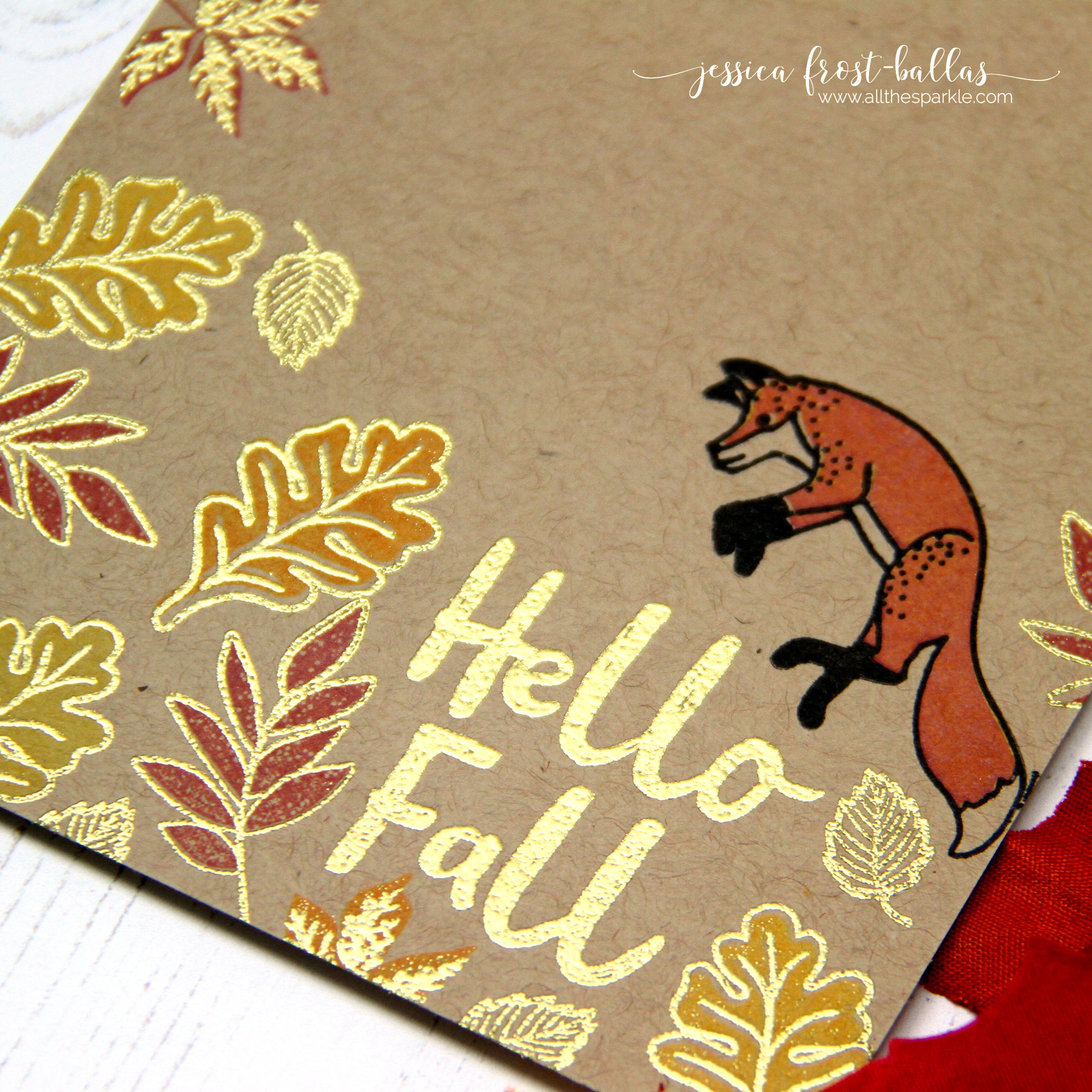 Next I stamped the bottom layer of the leaves with fossilized amber, fired brick, and wild honey distress oxide ink. I blasted it briefly with a heat gun to dry the distress oxide ink and then stamped the top layer with versamark before heat-embossing it with gold embossing powder. I love the fox with the gold and warm fall colors on kraft cardstock. And I’m officially ready for apple cider, falling leaves, and cooler temperatures! 😉 Thanks for visiting, happy Monday, and have a fabulous day!