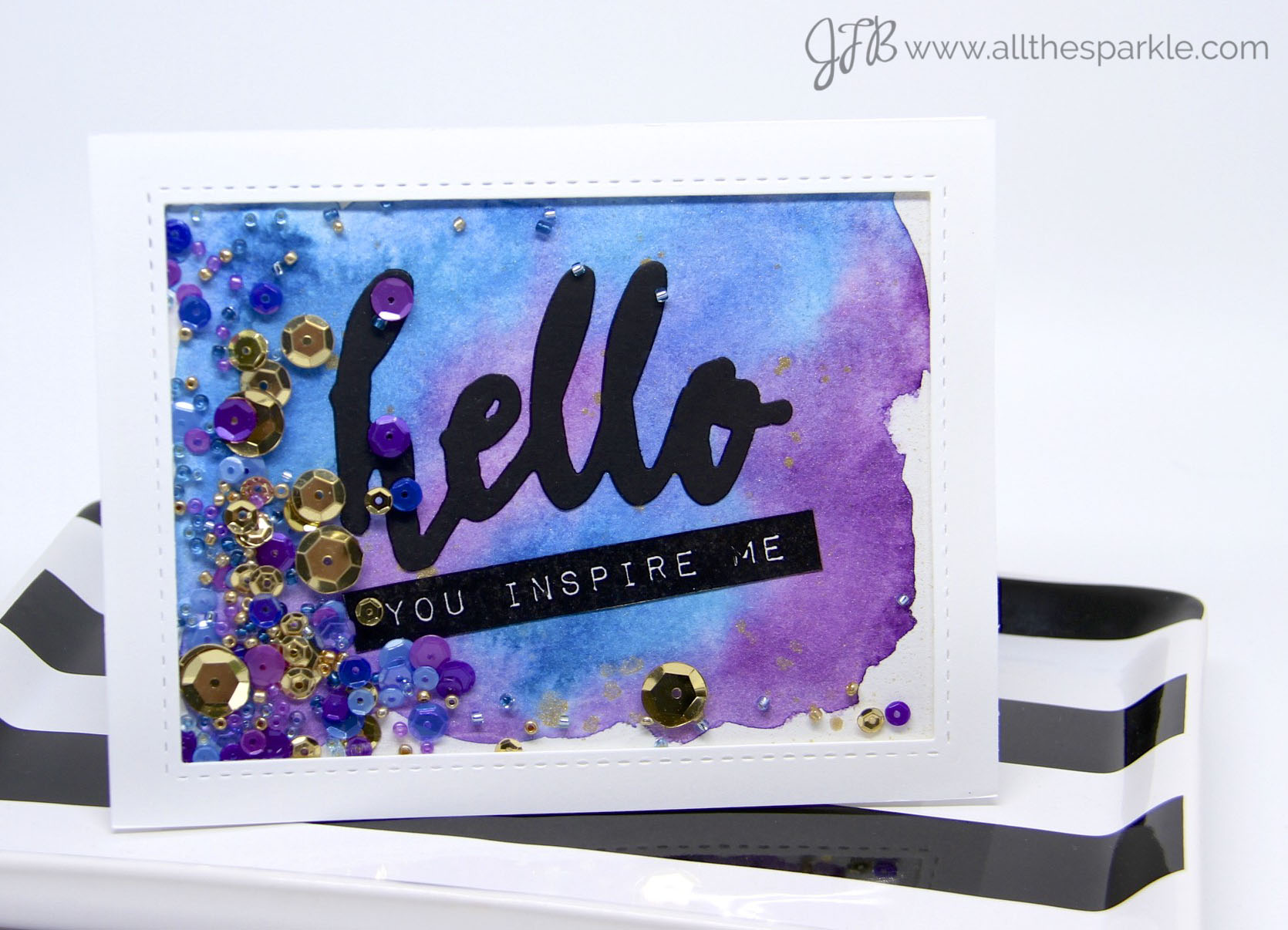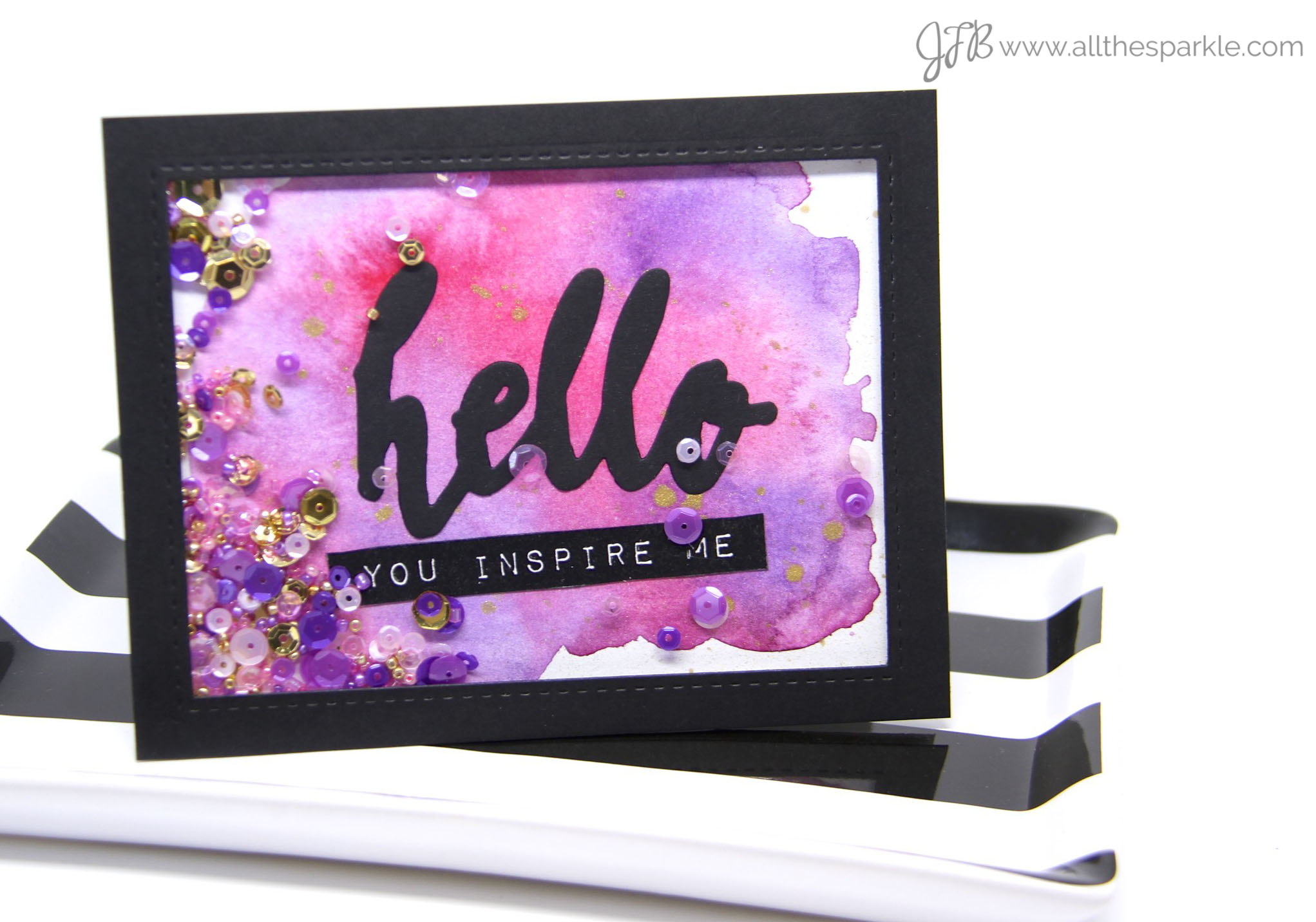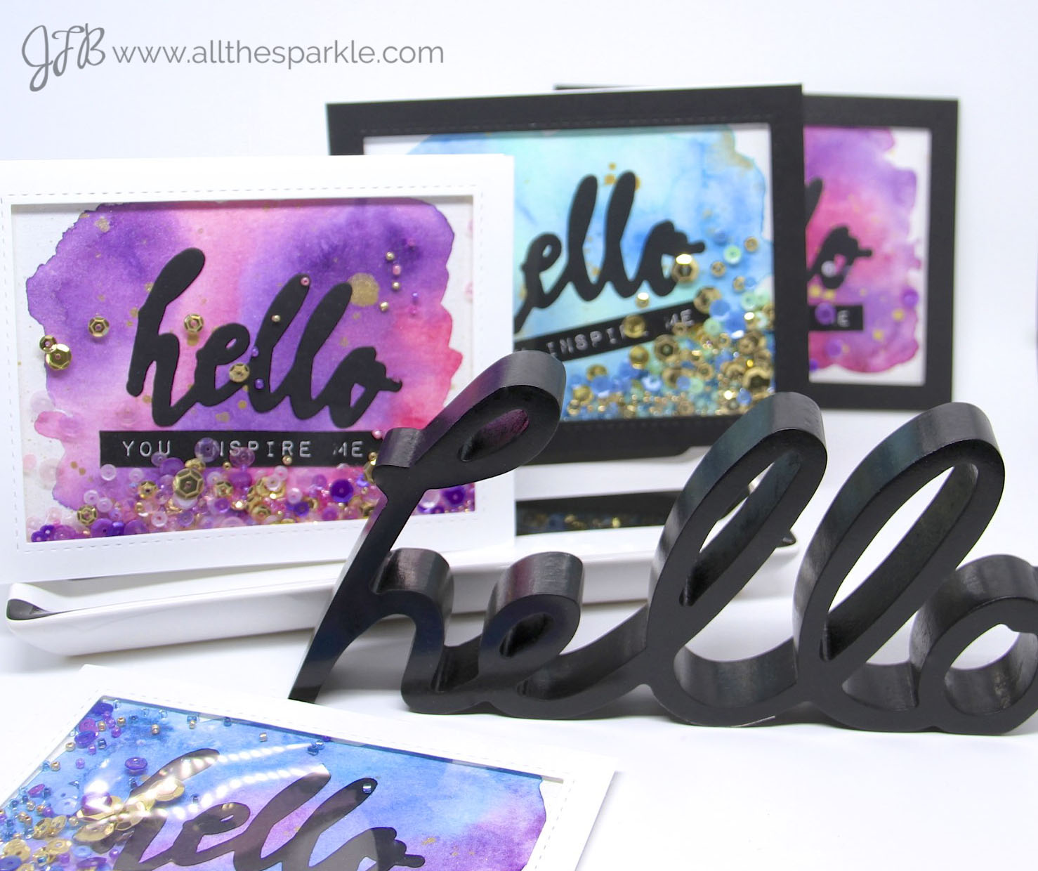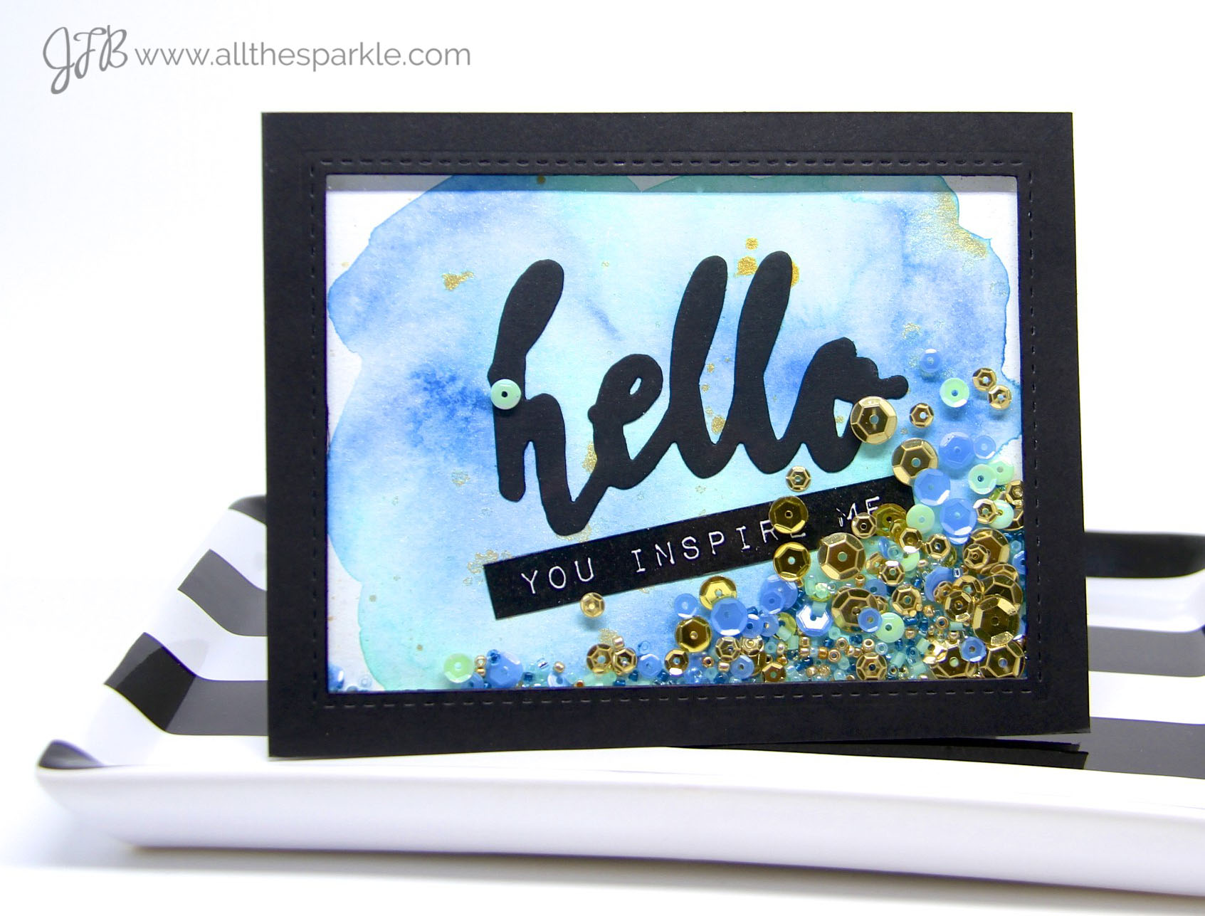 I used Gansai Tambi watercolors to create watercolor washes on several pieces of watercolor paper. I let them dry overnight and then I added flecks of gold paint. The ‘hello’ sentiment is a die from Altenew and the label sentiments are also from Altenew! I filled each shaker with coordinating colors of sequins and beads and also gold sequins and beads!