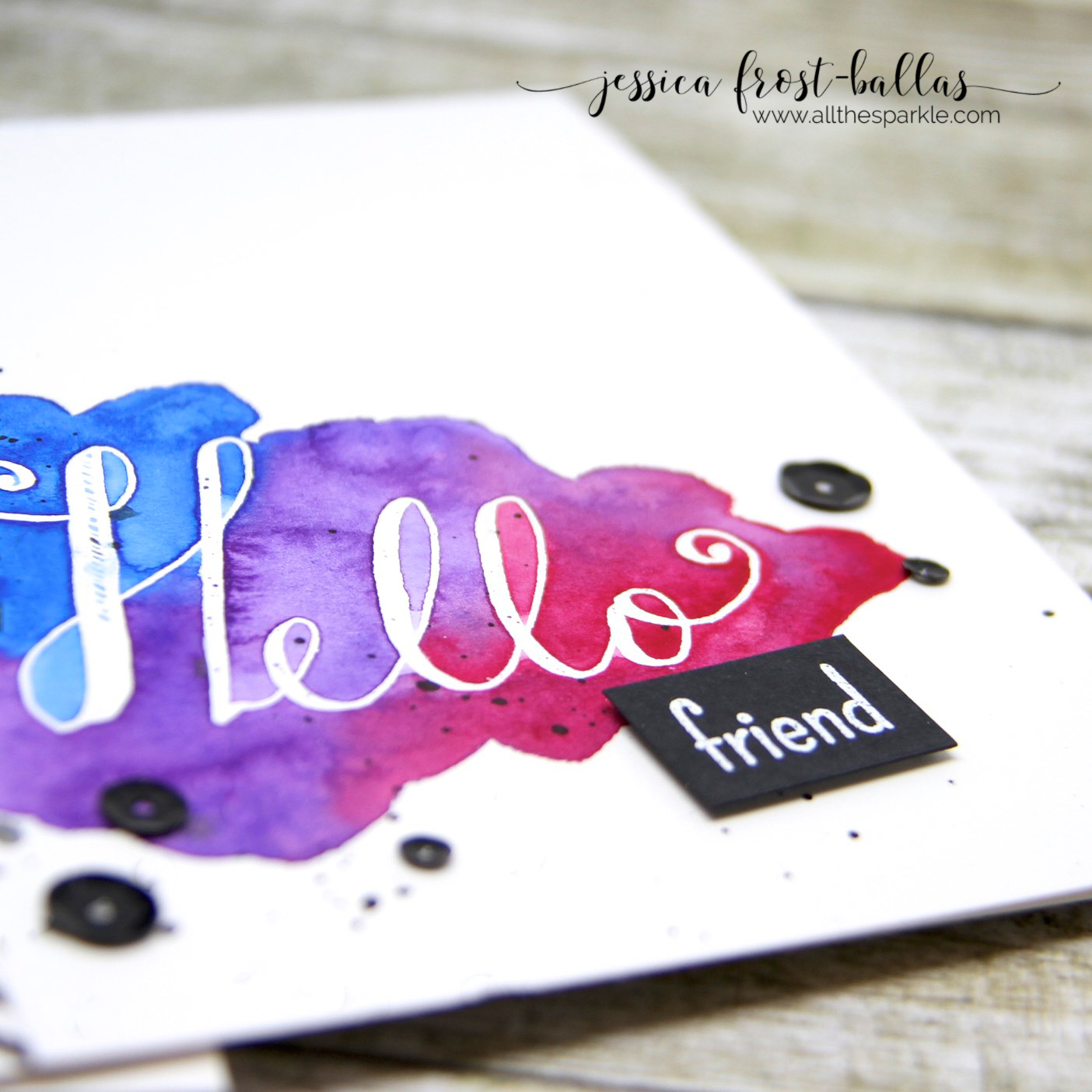 First I stamped the sentiment with versamark and heat-embossed it with white embossing powder. Next I wet a loose shape on the paper around the sentiment and then added watercolors. I allowed the colors to mix and then set it aside to dry. Once it was totally dry I splattered it with black ink.