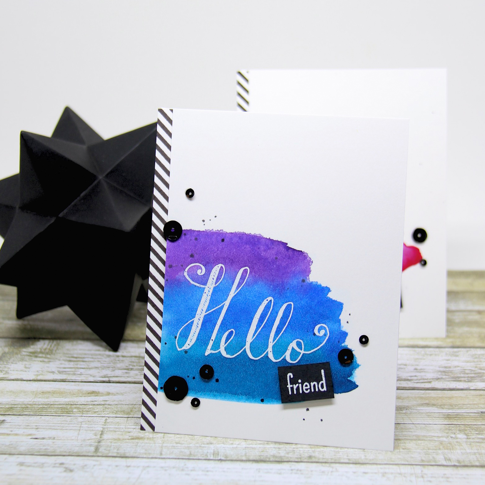 My second card follows a similar design but I painted stripes in cool shades of blue and purple. These were really fun to make (I love playing with watercolors) and you could make endless card sets using the Hello World stamp set and watercolors! I hope you like them!