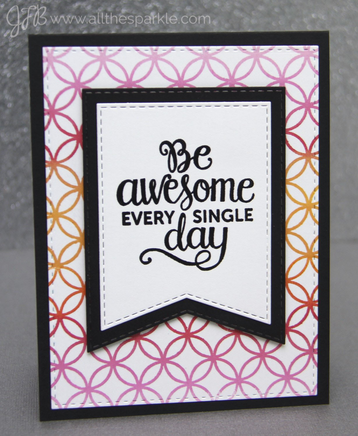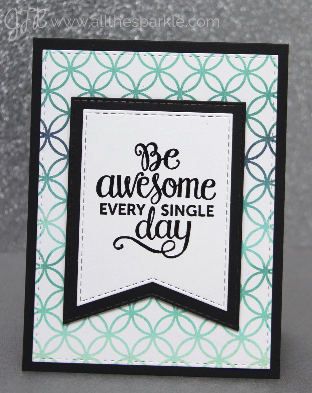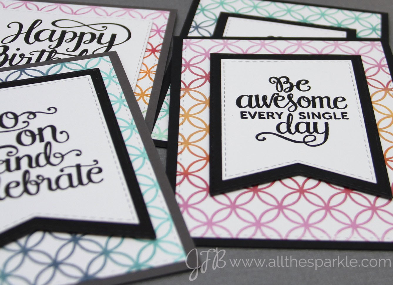 I won’t go into too much detail but the background stamp I used is the Penny Black Allover Pattern cling stamp. The sentiments are from the Splendid and Make a Wish Mama Elephant stamp sets and were stamped in versafine onyx black and heat-embossed with clear embossing powder. I die-cut the banners from the My Favorite Things Stitched Jumbo Fishtail Banner STAX and layered some of them with black cardstock. The card bases are Simon Says Stamp black and slate grey cardstock.