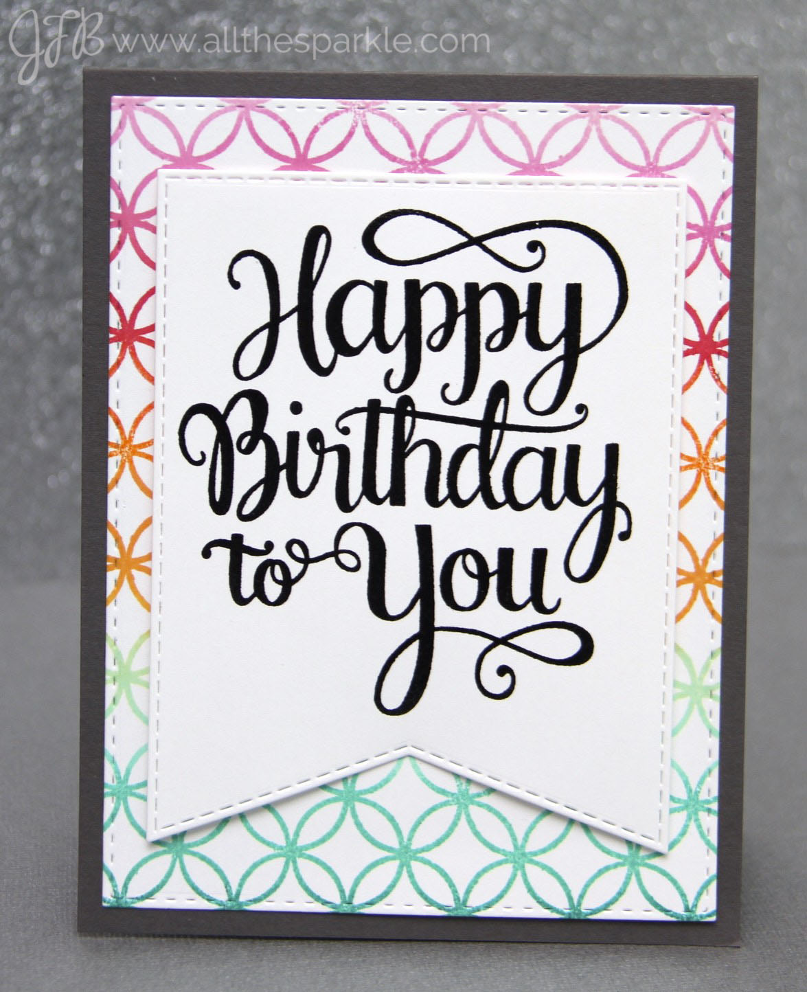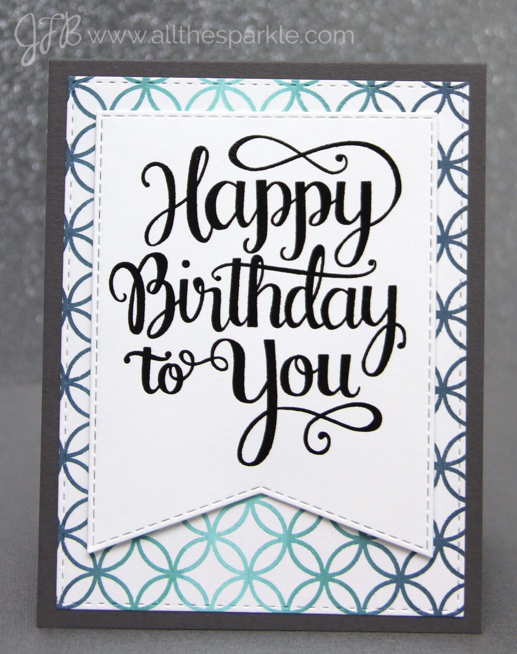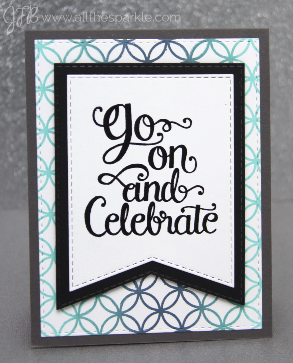 I won’t go into too much detail but the background stamp I used is the Penny Black Allover Pattern cling stamp. The sentiments are from the Splendid and Make a Wish Mama Elephant stamp sets and were stamped in versafine onyx black and heat-embossed with clear embossing powder. I die-cut the banners from the My Favorite Things Stitched Jumbo Fishtail Banner STAX and layered some of them with black cardstock. The card bases are Simon Says Stamp black and slate grey cardstock.