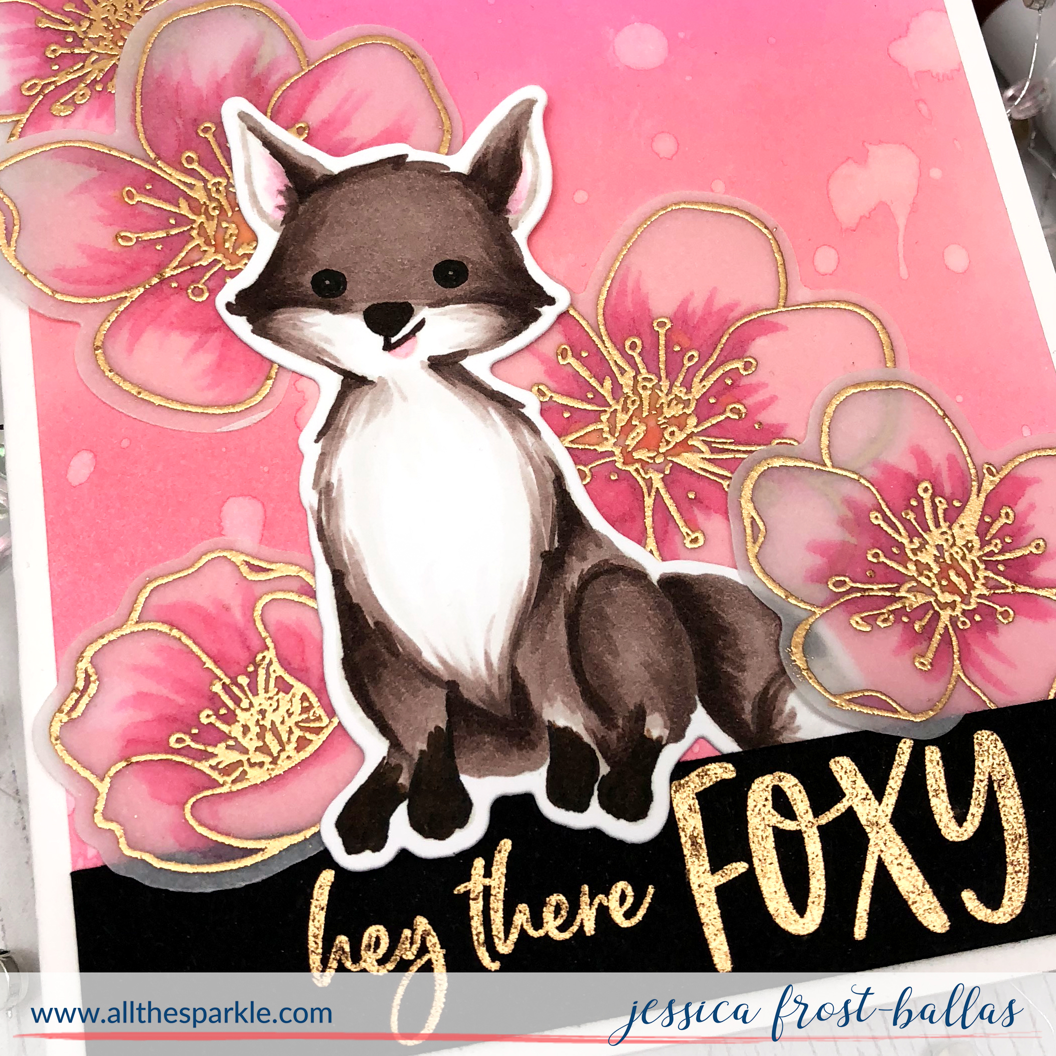 Next I stamped the Spring Blossoms onto vellum and heat-embossed them with rose gold embossing powder before die-cutting them with the coordinating dies. I added pink and golden yellow accents with copic markers to the back of the vellum. I also stamped the sentiment from Foxy Sentiments onto black cardstock and heat-embossed it with the same rose gold embossing powder. Then I blended picked raspberry and worn lipstick distress oxide ink onto a piece of watercolor cardstock and spritzed it with water. I adhered that to a white card base and then arranged my sentiment and vellum flowers across the blended panel. Finally I popped up my fox with foam mounting tape. I don’t know if foxes like to sit and smell the flowers but mine certainly does! 😉