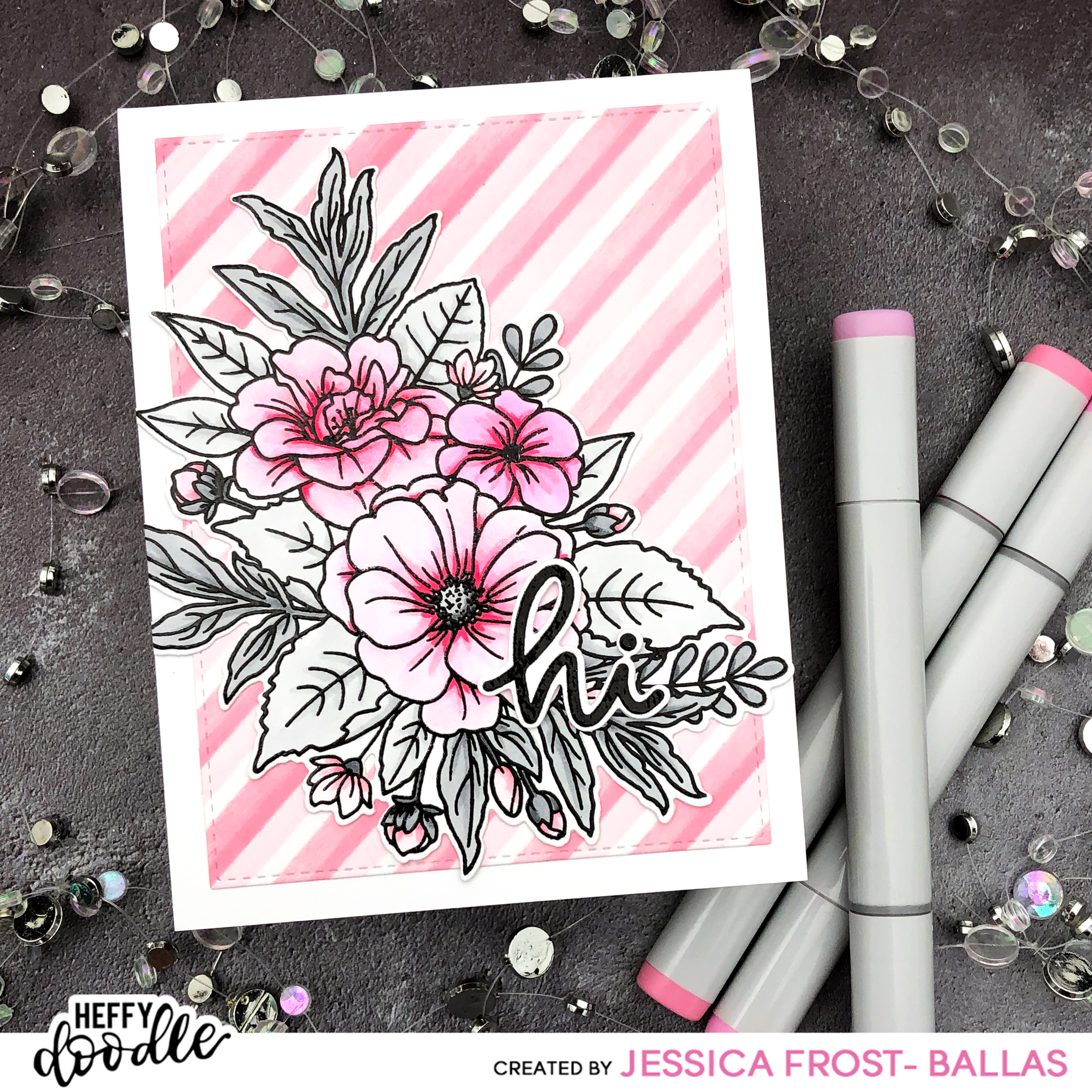 Next I stamped the gorgeous Love You Bunches floral arrangement from Trinity Stamps onto white cardstock with versafine and heat-embossed it with clear embossing powder. Then I colored it with a few pale pink copics and lighter neutral gray copics. I added a few darker touches of pink and then die-cut it with the coordinating die. I used the second to largest Stitched Rectangle die from Heffy Doodle to cut my stencil paneled and then adhered that to a white card base. Next I adhered my floral arrangement and trimmed off the overhang. Finally I stamped a sentiment from Heffy Doodle’s Hello Everyone on white cardstock with versafine and heat-embossed it with clear embossing powder before die-cutting it with the coordinating die. I die-cut the shape three more times from white cardstock and layered them together for a thicker sentiment and then adhered that to the card panel. Finally I applied a thick layer of spectrum noir clear sparkle to the flowers to finish the card!