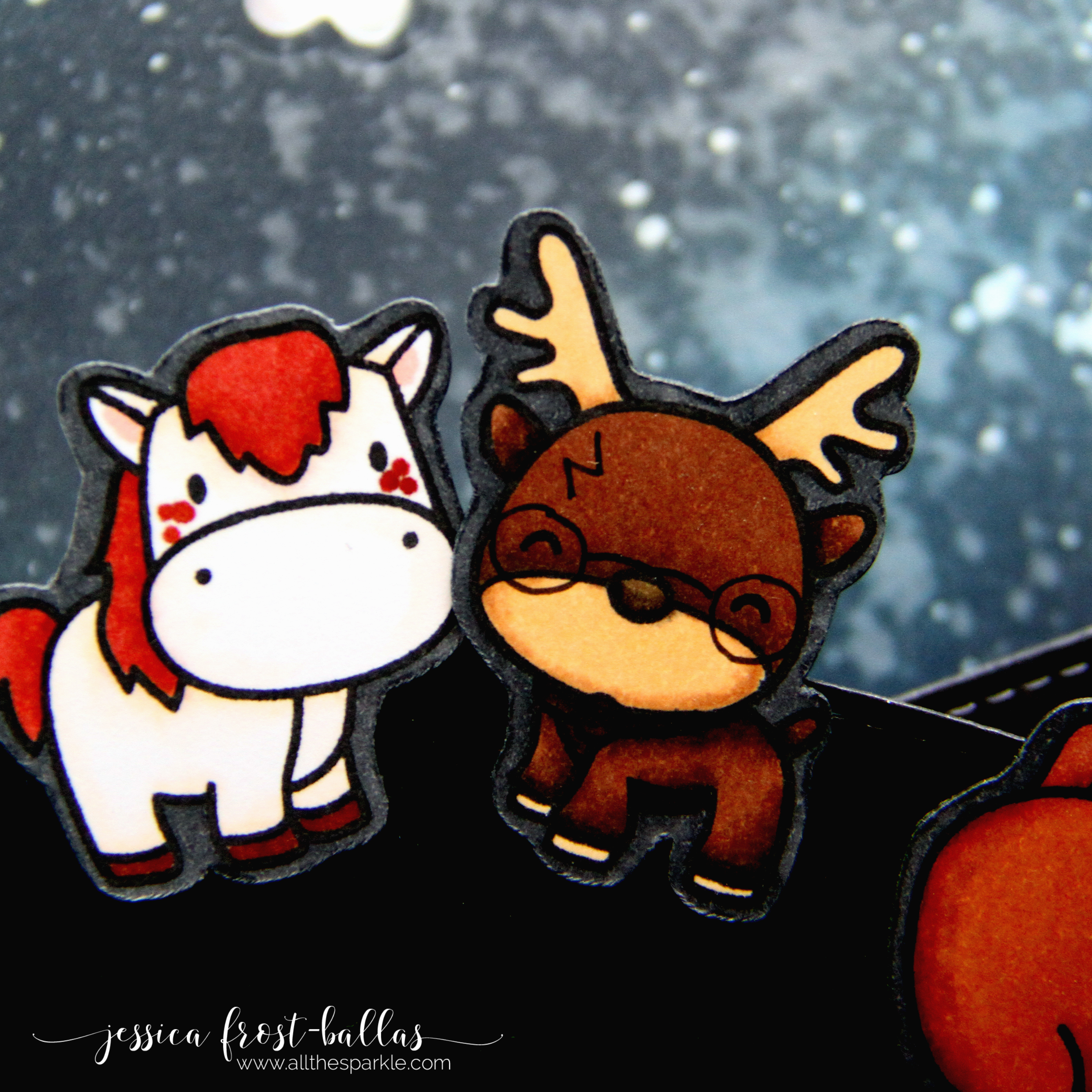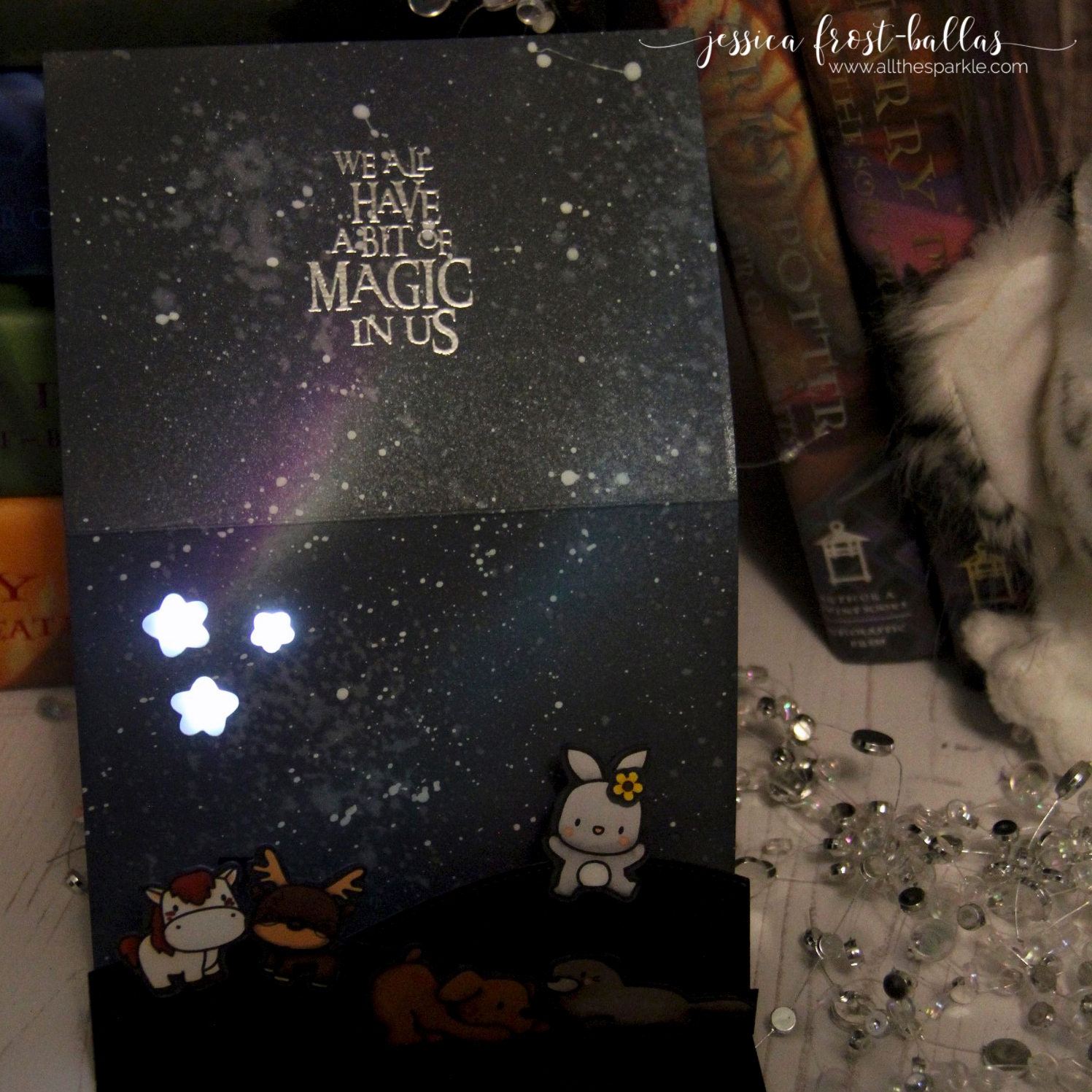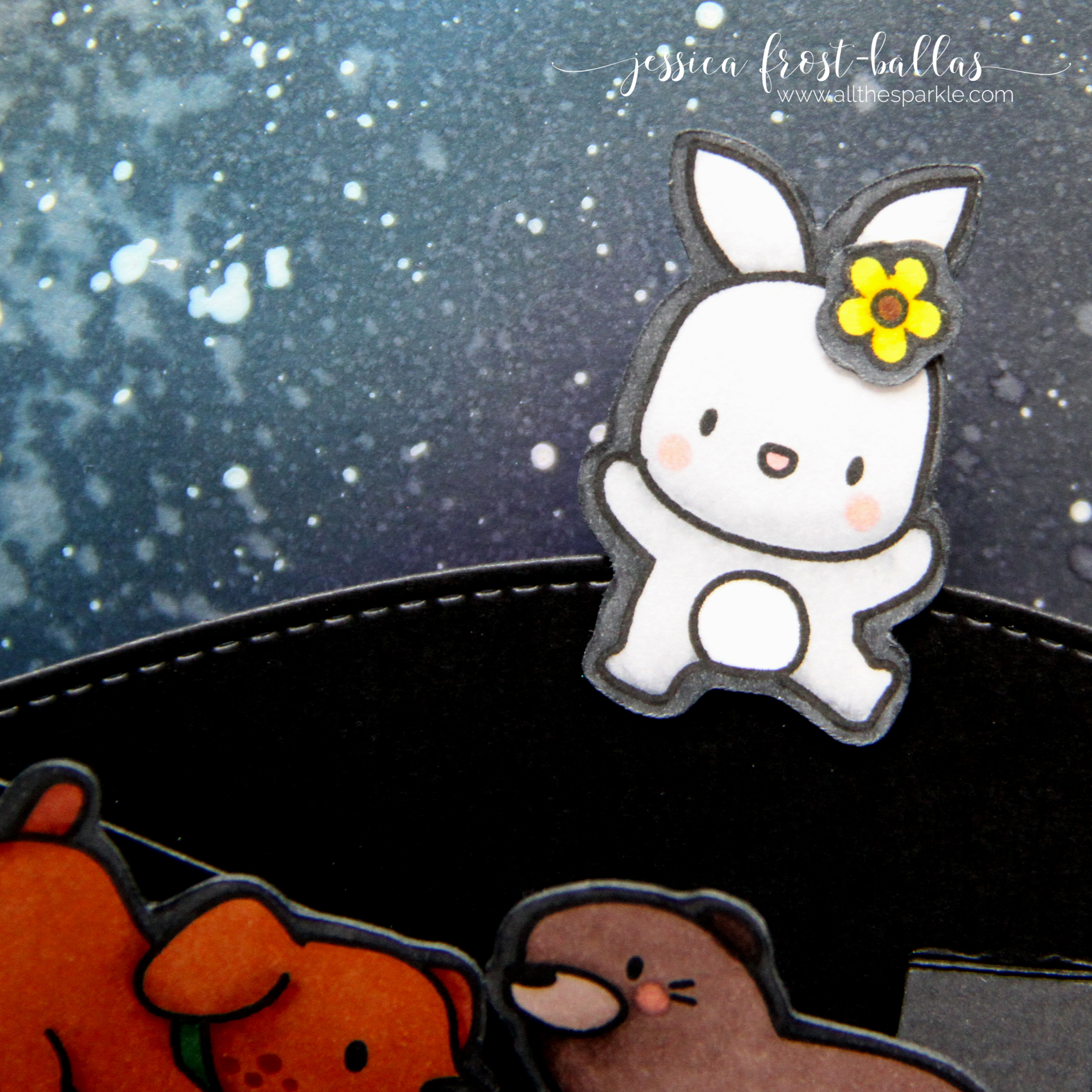 I adhered vellum behind the die-cut stars to hide the writing on the stickers but allow the light to shine through. I applied a little spectrum noir clear sparkle to the vellum for a little extra sparkle. Then I adhered the bottom half of the night sky panel over the circuit panel with ATG adhesive. Next I added adhesive to the back of the Stitched Hillside pop-up flaps and closed the card to adhere the flaps to the night sky background. Finally I adhered the critters with ATG adhesive to finish the card!