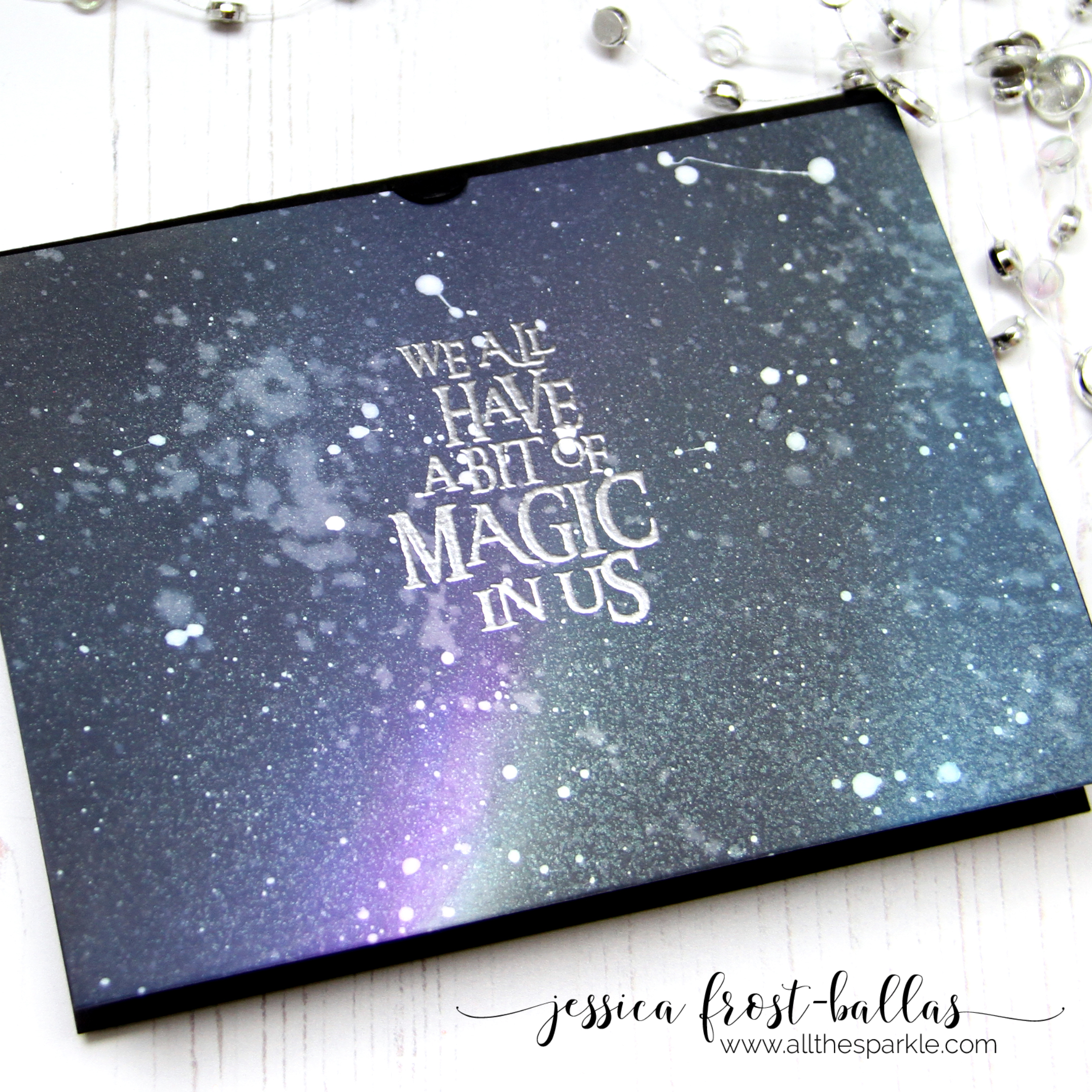 I started by creating my night sky/galaxy background on a piece of Tim Holtz distress paper cut to 5.5″ by 8.5″. I blended wilted violet, salty ocean, and cracked pistachio distress oxide ink onto the panel and then blended black soot over the top. I let bits of the color peek through the black soot and added a little more salty ocean and cracked pistachio on top. After it dried I spritzed it with water using two different sprayers to get a variety of water droplet sizes. I blotted off the excess water and let it dry again. Then I spritzed it with WPlus9 shimmer spray (I believe this is discontinued but you could substitute it with Tsukineko frost or sparkle spray for a similar look) and dried it with my heat gun. Finally I flicked the panel with white acrylic paint to create stars and then set it aside to dry completely.