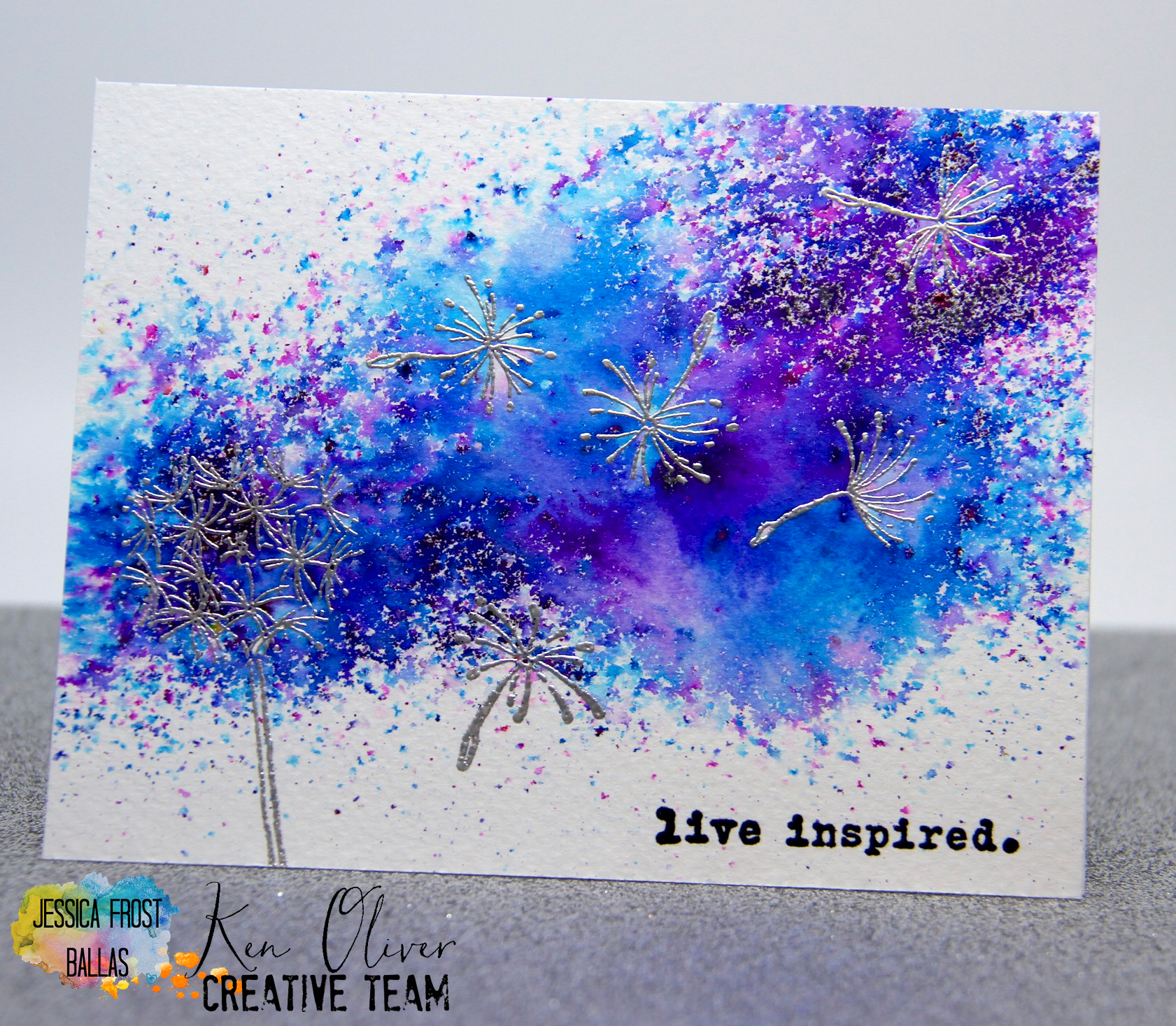 I really loved these dandelion stamps and the implied movement in their shape. My first inclination was to try to visually create wind and the colorburst powders were the perfect medium to convey that feeling! To create my card I stamped the dandelions in versamark and heat-embossed them with silver embossing powder. Then it was time to get messy!! 😉