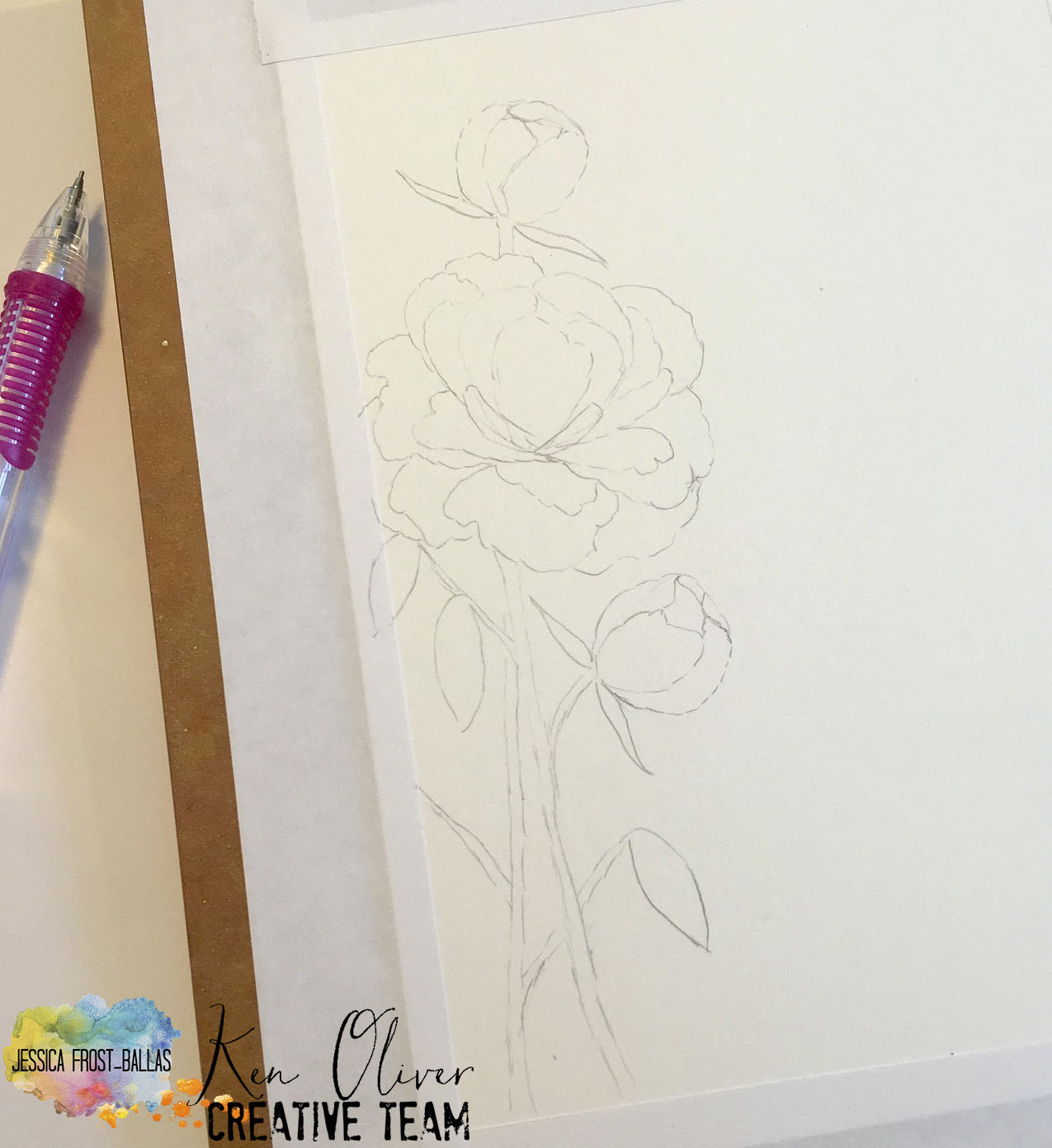 I started off by sketching a peony flower and buds on a piece of watercolor paper. It’s not the most realistic sketch but I wasn’t really aiming for realism. After I finished sketching it out I went over the lines lightly with a white crayon.
