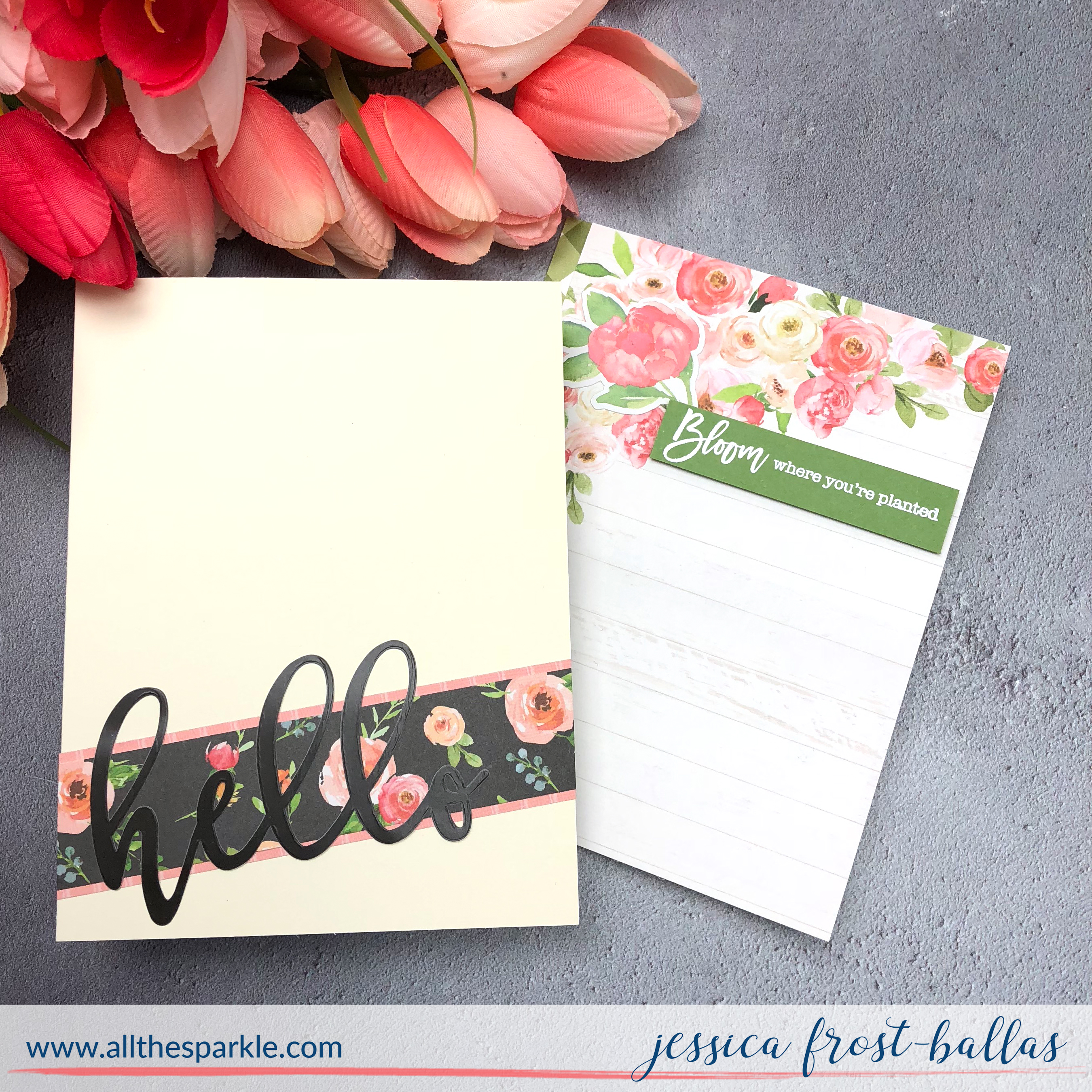 The kit includes these gorgeous patterned papers, cardstocks, and stickers so it was super quick to assemble these cards. I did stamp the sentiment from one of the sets onto green cardstock and heat-embossed it with white embossing powder for the white and floral card.