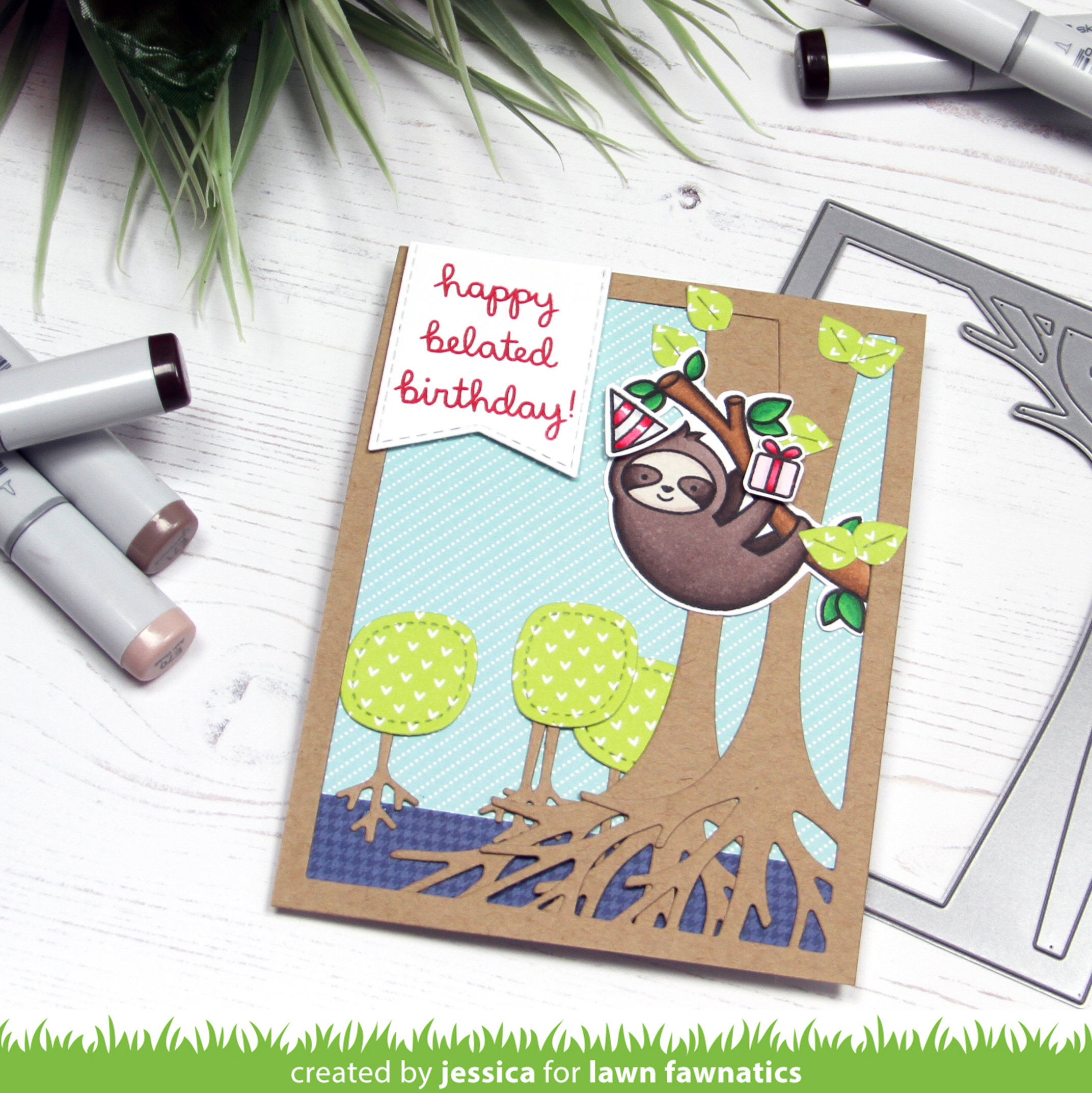 I thought the die was a perfect substitute! Next I trimmed two blue patterned papers from Lawn Fawn to create my water and sky background. I die-cut the Stitched Tree Borders using the same kraft paper for the trunks and green patterned paper for the foliage and then turned them upside down to create mangroves in the distance of my scene. I also adhered leaves from the Leafy Tree Portrait die to the trunks of my mangroves in the foreground of my scene. Then I stamped the sloth, the party hat, and his tree branch from Hang In There and the gift from Year Five and colored them with copics before fussy cutting-them.