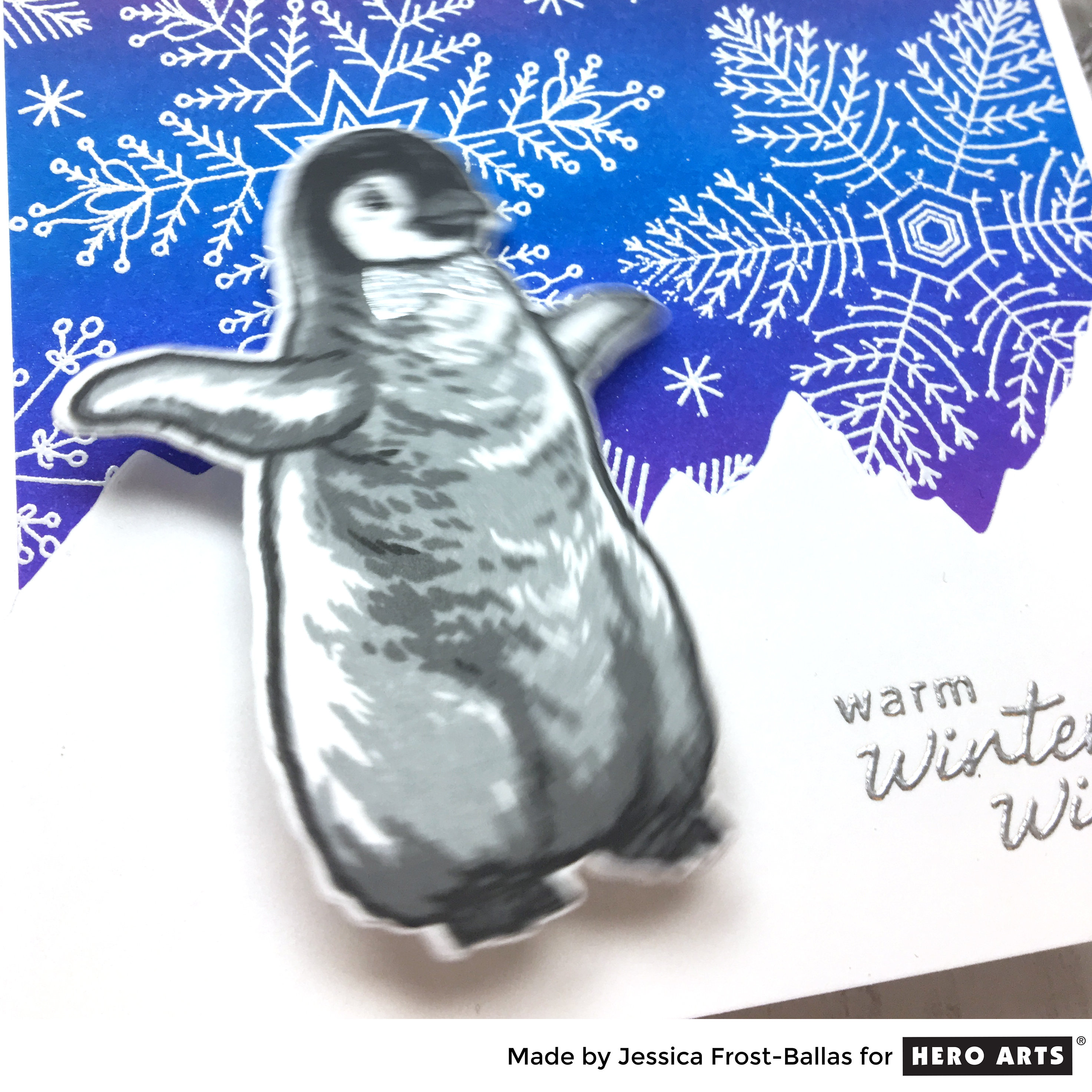 I love that adorable little penguin from our holiday release! All that fabulous dimension and texture is simply created by layered stamping with different inks! I started by stamping him with soft granite, charcoal, and intense black ink and then die-cut him with the coordinating die. I also stamped his cute little bowtie with versamark and heat-embossed him with silver embossing powder. Next I blended picked raspberry, salty ocean, and wilted violet distress ink onto a piece of white cardstock and let it dry completely. Then I stamped the Hand Drawn Snowflakes cling stamp with versamark and heat-embossed it with white embossing powder. I die-cut the snowy mountains using one of the dies from the October My Monthly Hero kit and stamped the sentiment from Color Layering Penguin and heat-embossed it with silver embossing powder. Finally I adhered the mountains to the background and adhered the penguin with an action wobbler! So now he can shiver while waiting for those Warm Winter Wishes!! 😉