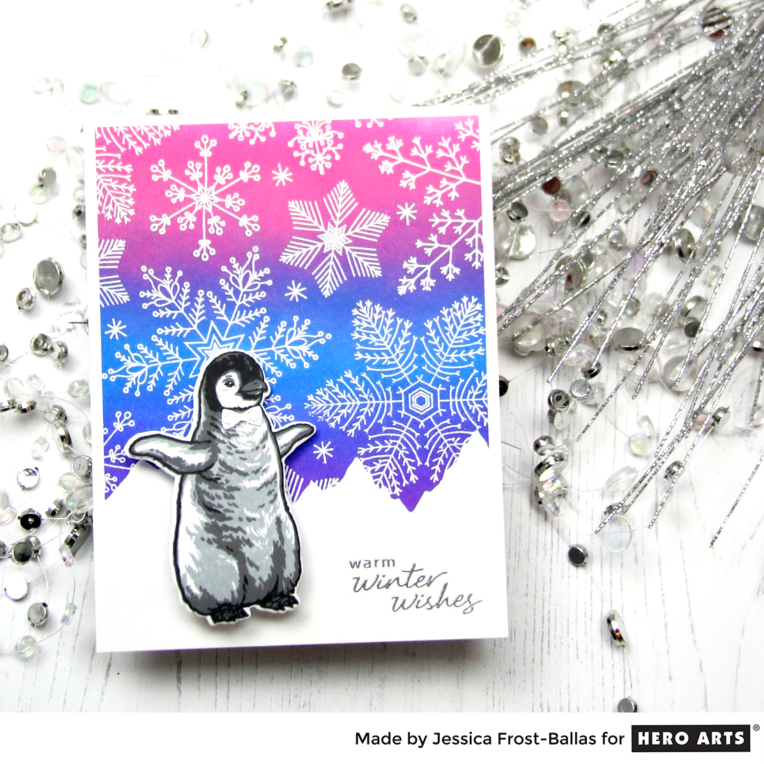 I love that adorable little penguin from our holiday release! All that fabulous dimension and texture is simply created by layered stamping with different inks! I started by stamping him with soft granite, charcoal, and intense black ink and then die-cut him with the coordinating die. I also stamped his cute little bowtie with versamark and heat-embossed him with silver embossing powder. Next I blended picked raspberry, salty ocean, and wilted violet distress ink onto a piece of white cardstock and let it dry completely. Then I stamped the Hand Drawn Snowflakes cling stamp with versamark and heat-embossed it with white embossing powder. I die-cut the snowy mountains using one of the dies from the October My Monthly Hero kit and stamped the sentiment from Color Layering Penguin and heat-embossed it with silver embossing powder. Finally I adhered the mountains to the background and adhered the penguin with an action wobbler! So now he can shiver while waiting for those Warm Winter Wishes!! 😉