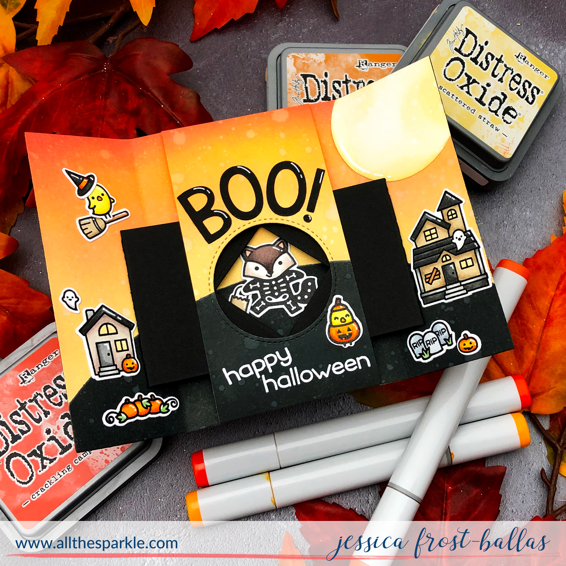 I combined images from Spooky Village and Fox Costume Before ‘N Afters to create my scene and then added sentiments from Finley’s ABCs and Fox Costume Before ‘N Afters! I colored the images with copic markers and then added accents with a white gel pen. My background is blended with Scattered Straw, Dried Marigold, Wild Honey, Crackling Campfire, and Black Soot distress oxide ink and the moon is blended with Antique Linen and Scattered Straw!