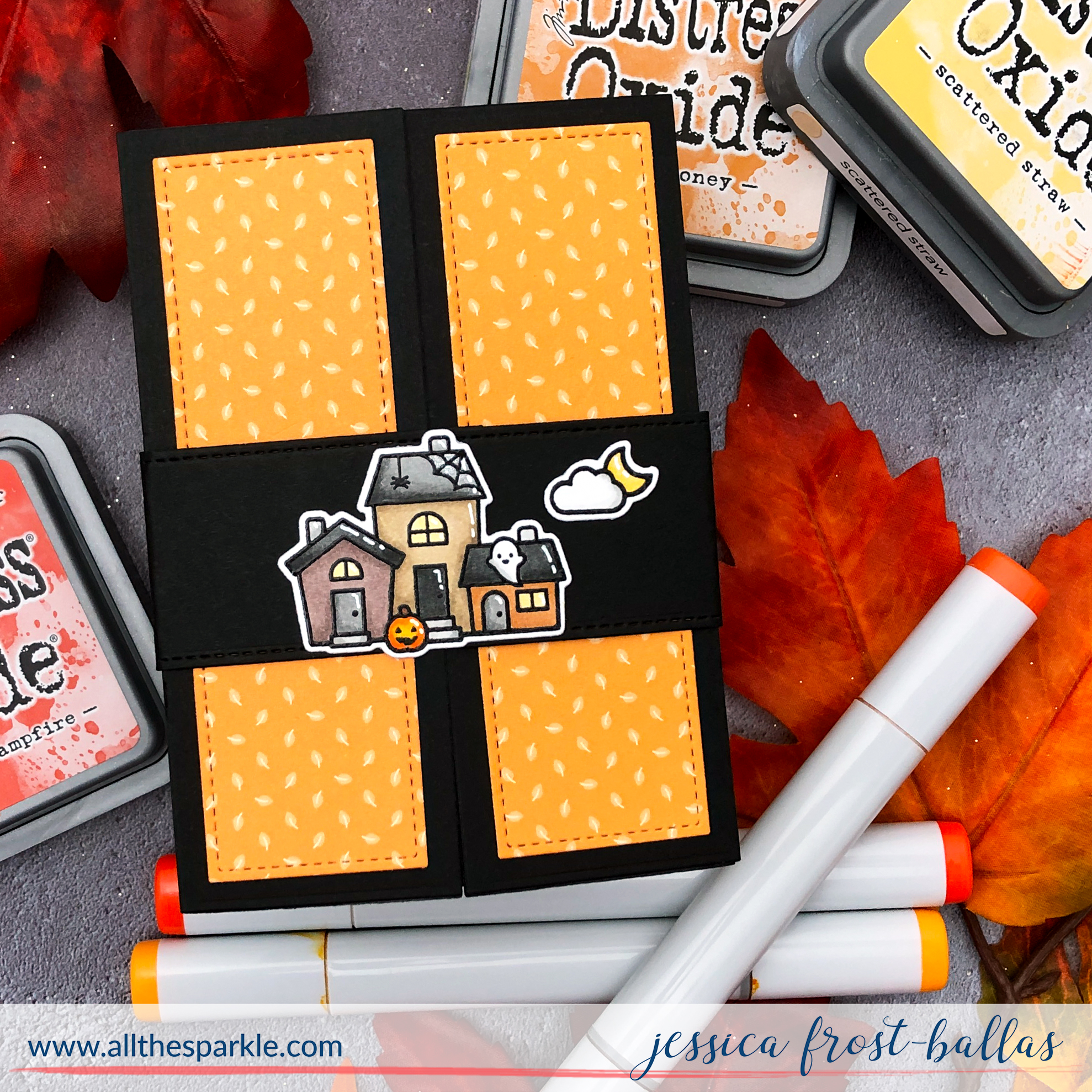 The front of my card has panels die cut from the retired Fall Fling patterned paper pad (yes, I hoard Lawn Fawn patterned paper…ha)! Then I added a few more images from Spooky Village to give you a little hint of what’s inside! 😉