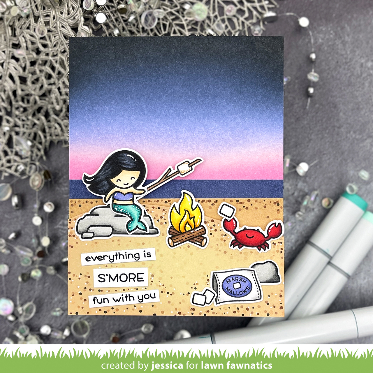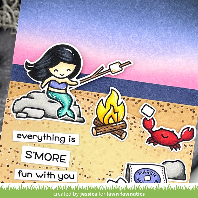 Next I stamped images from Mermaid for You, Life is Good, and S’More the Merrier with versafine and heat-embossed them with clear embossing powder before coloring them with copic markers. I die-cut them with the coordinating dies and then added them to my blended scene. Finally I added the sentiment from S’More the Merrier and a few white gel pen accents to finish the card!