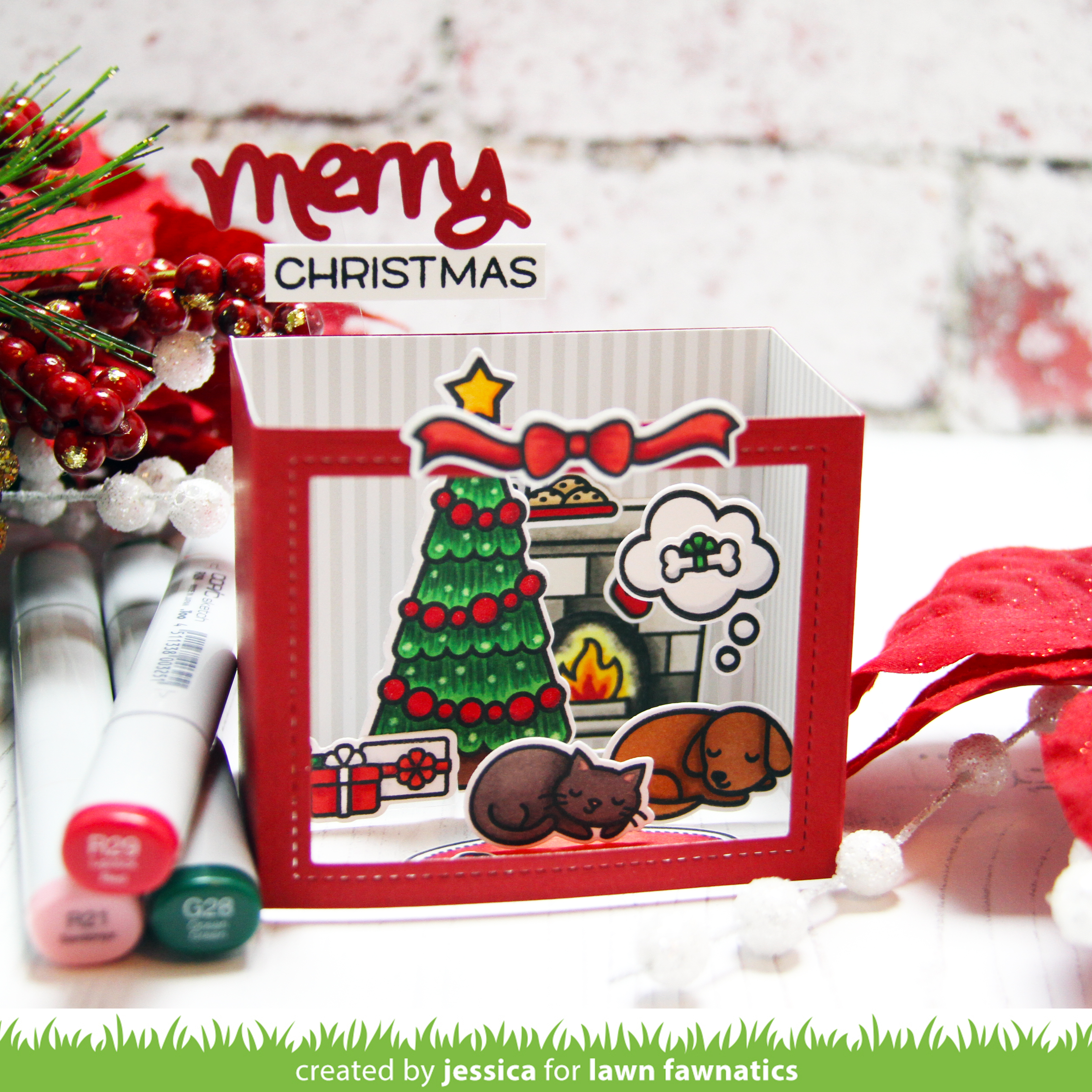 Good morning! It’s time for a new Lawn Fawnatics challenge and it might be my favorite one yet! We’re challenging you to create a scene using any Lawn Fawn stamps and dies! I decided to use some of the new stamps and dies from the Fall/Winter 2017 release to create a 3-dimensional scene!