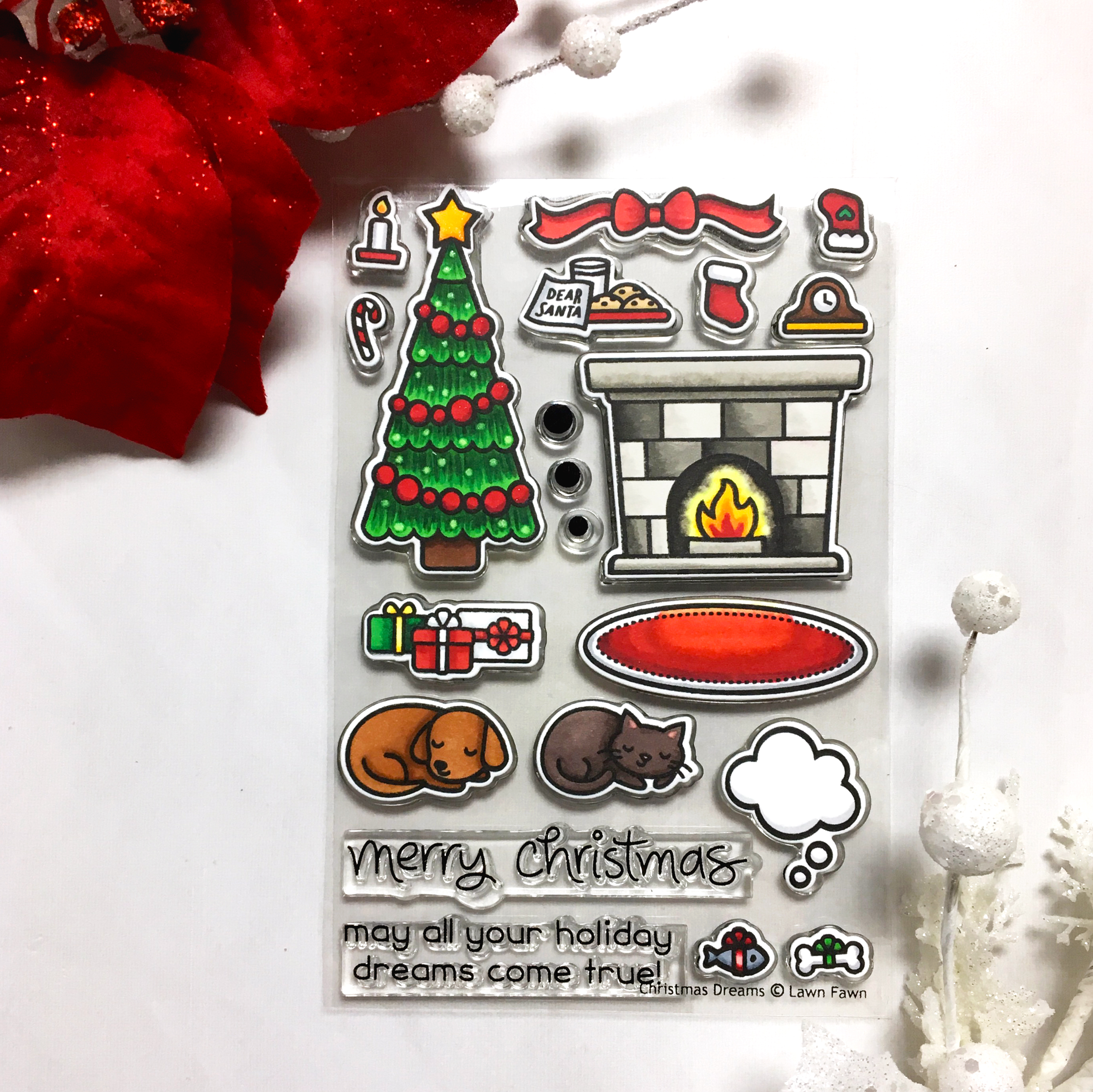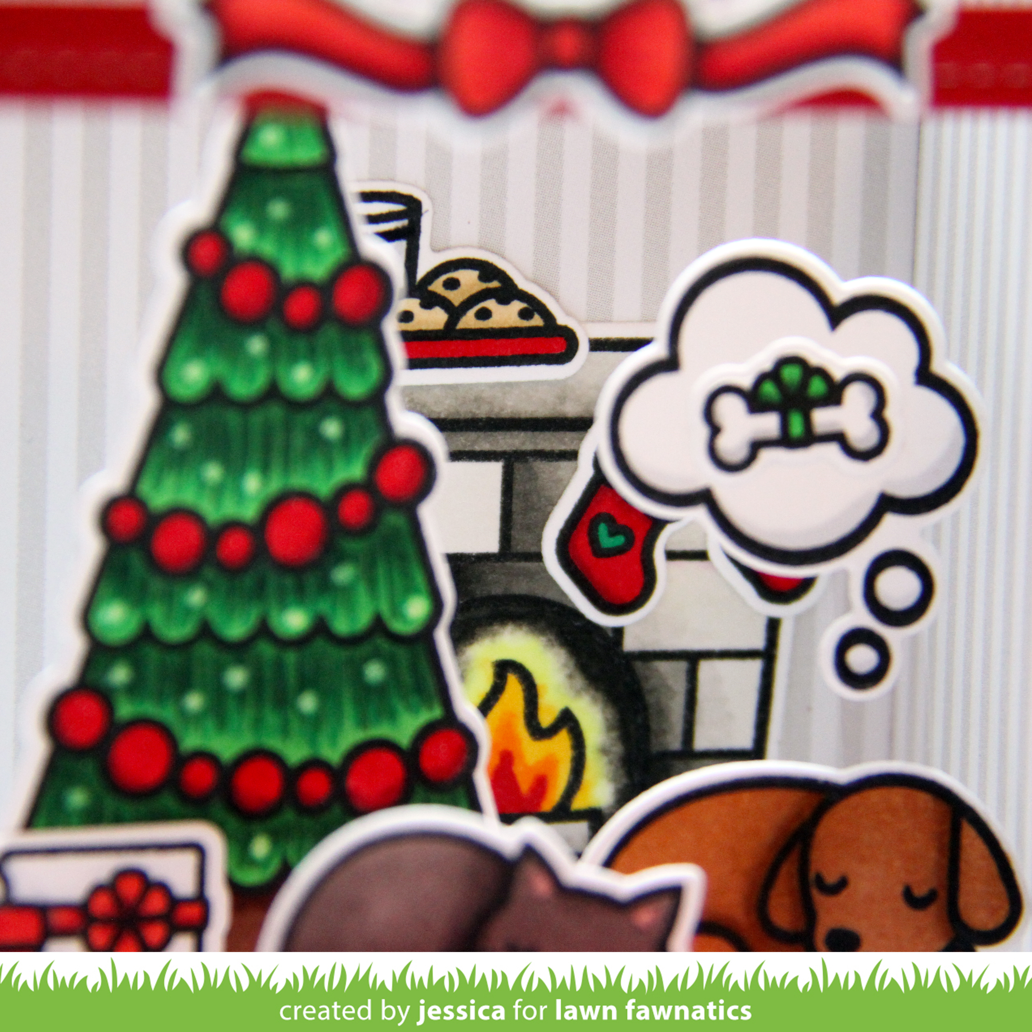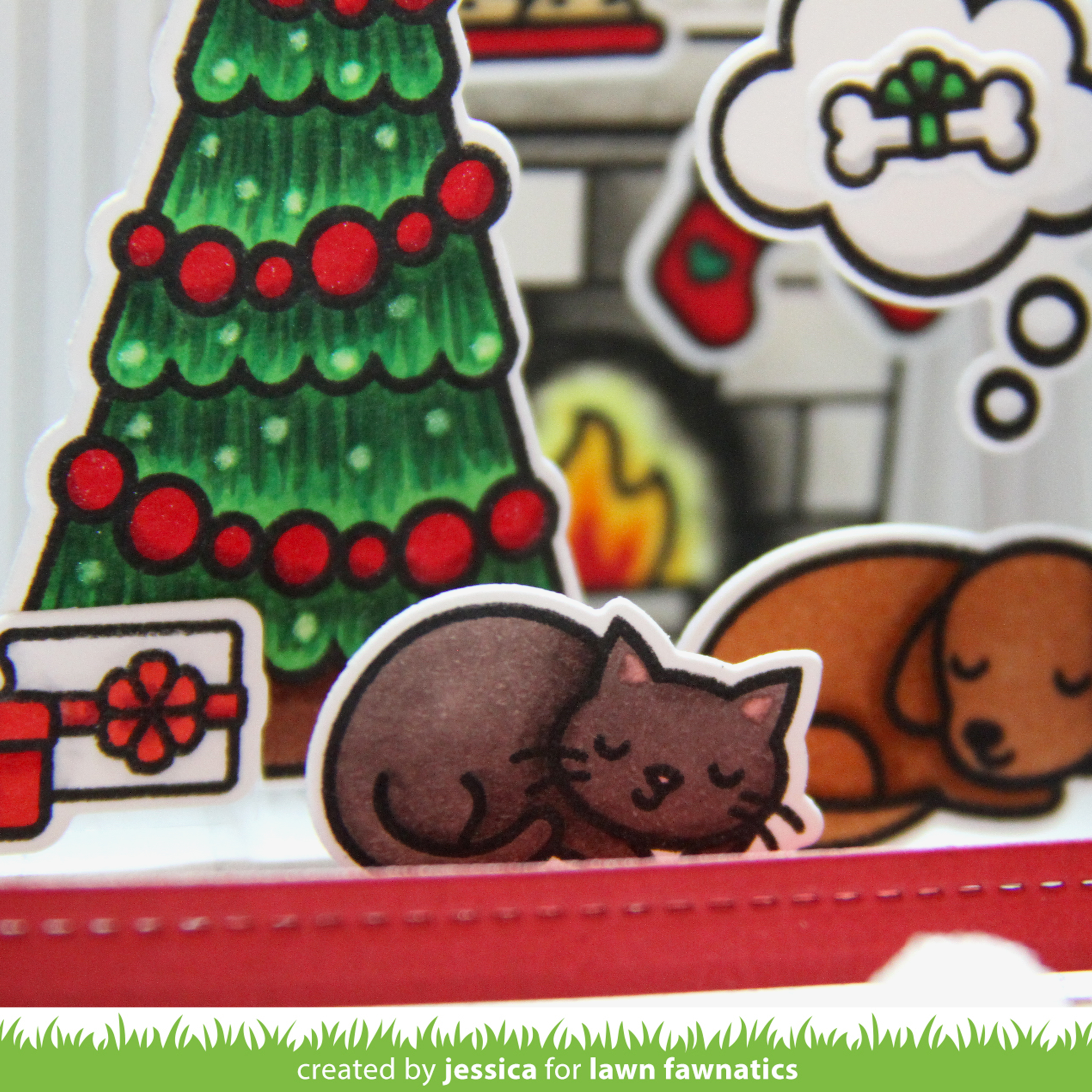 The next part of my scene was inspired by my cat and dog (though not colored to look like them because I have not yet conquered coloring a tortie cat or a mostly black dog). I like to imagine personalities for my pets and I feel like our dog, Archimedes, would be the kind of dog who would definitely plan ahead and buy Christmas gifts for his family. Rogue, on the other hand, would most definitely be a receiver and not a giver! Ha. So in my scene my dog is dreaming of his bone while my cat’s gift is waiting for her when she wakes up! 😉 Plus my cat tends to steal rugs and leave the dog on the hardwood floor so they’re also appropriately positioned in my scene! 🙂