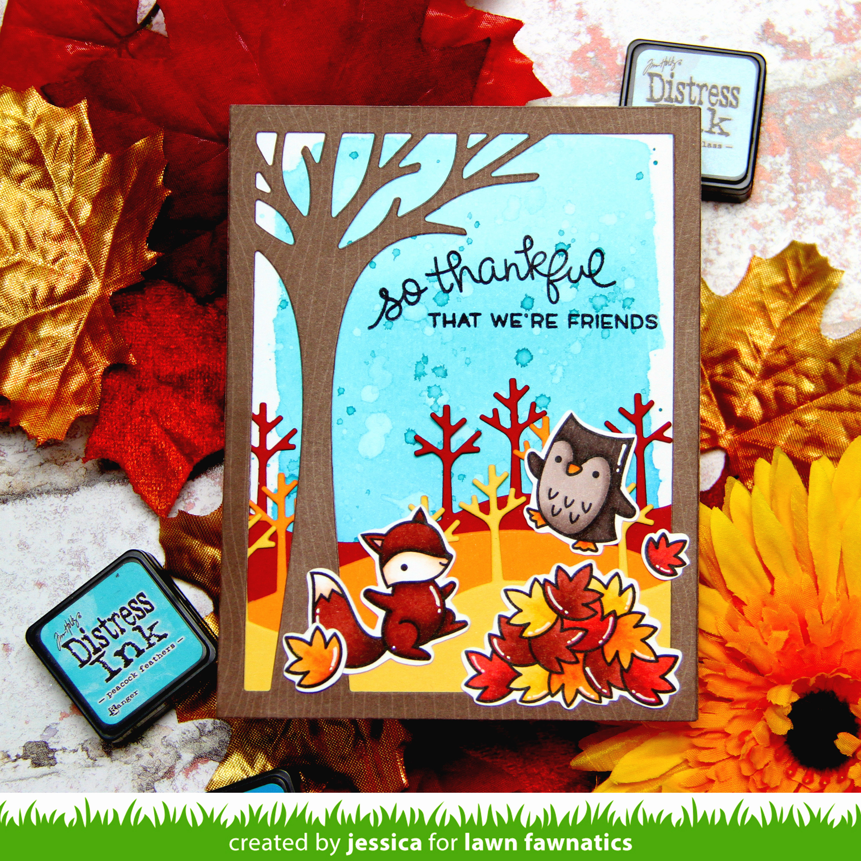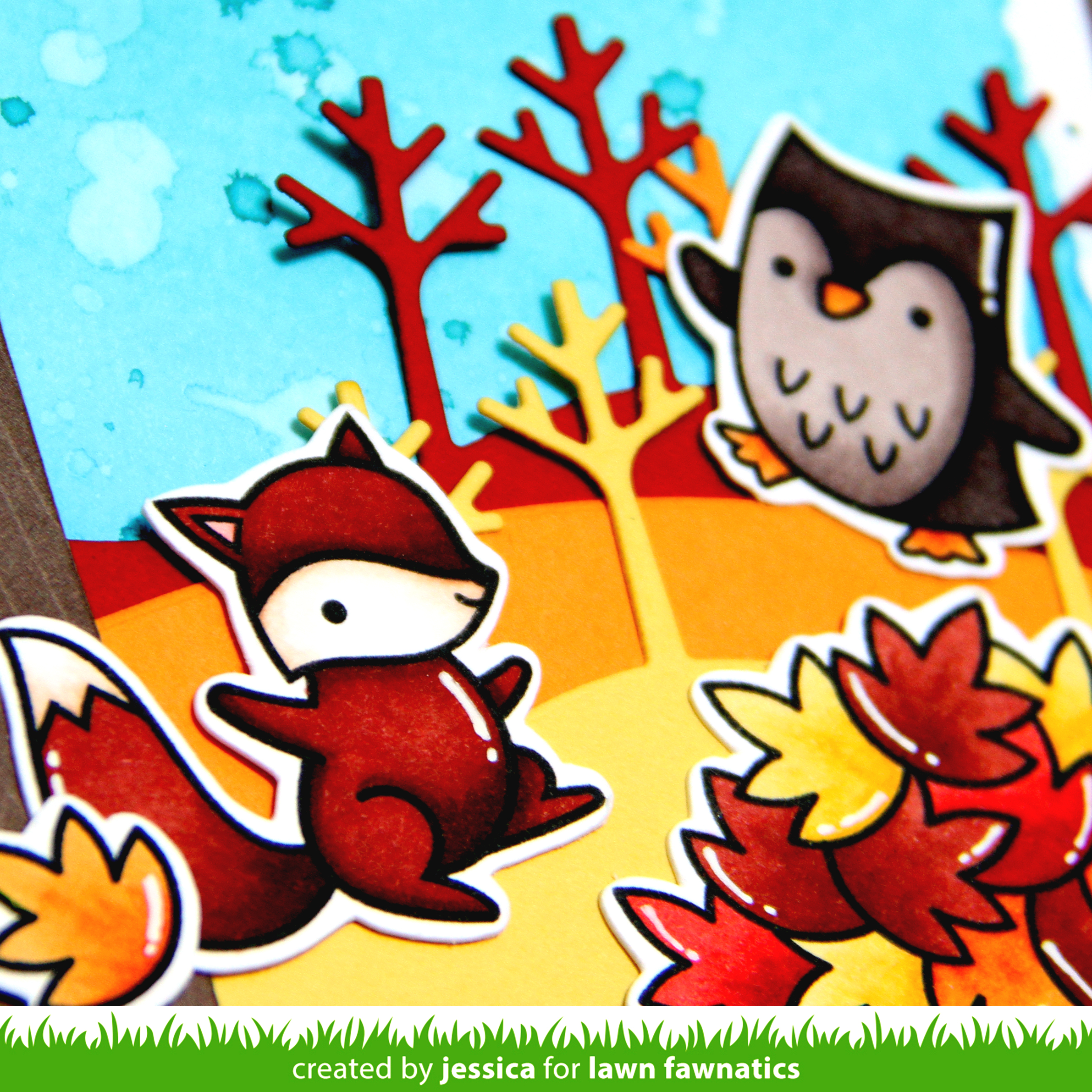 Once the background was dry I created my scene! I adhered the stitched tree borders to my background and then adhered the Leafy Tree Backdrop over it. Finally I added my leaf pile and critters and stamped the sentiment!
