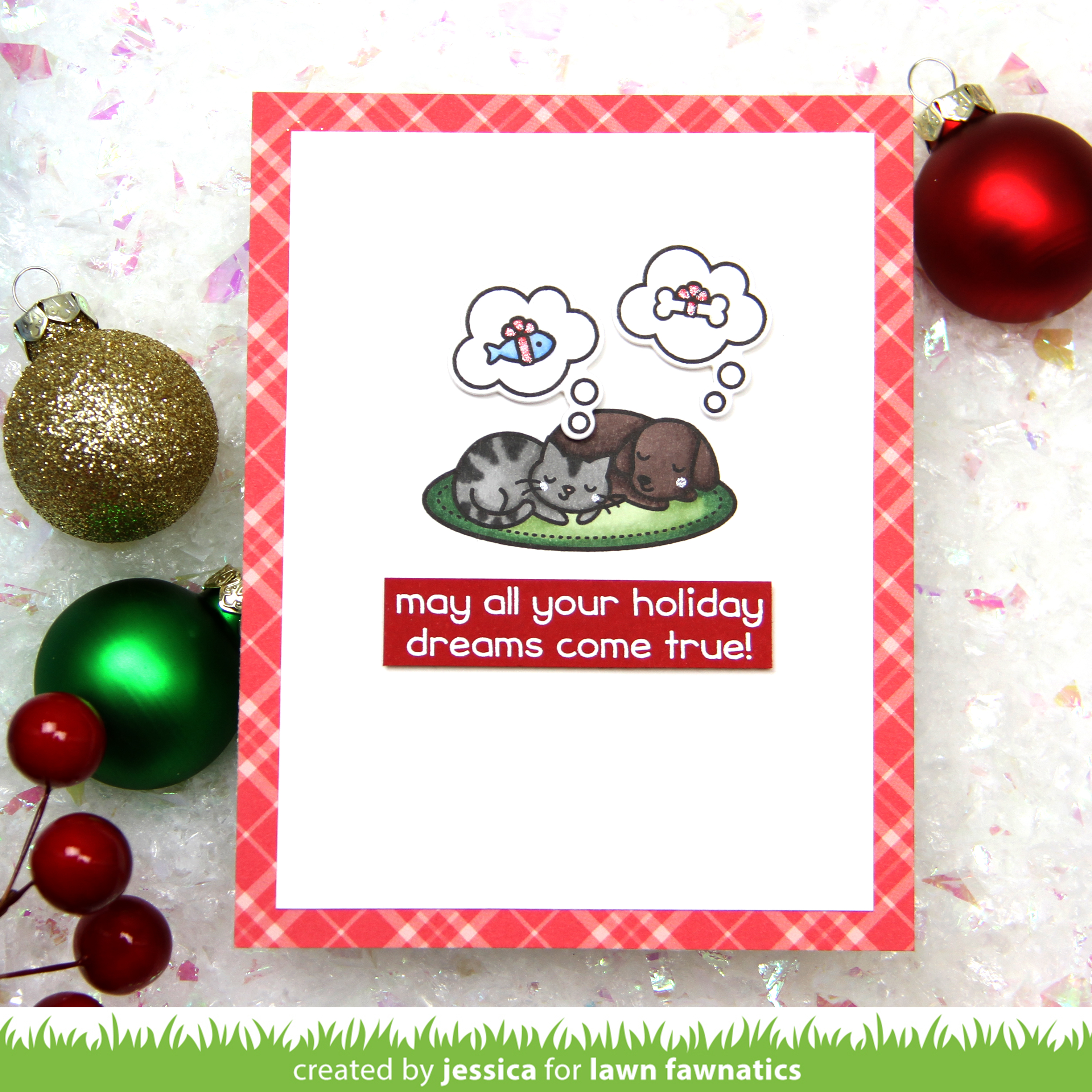 I started by stamping and masking the cute critters on a white card base. I colored them with copics and then added the rug under them. On a scrap piece of paper I stamped the dream bubbles with the fish and bone and colored them with copics before die-cutting them with the coordinating dies. I added a little spectrum noir clear sparkle to the cheeks of the dog and cat and the bows on their presents!