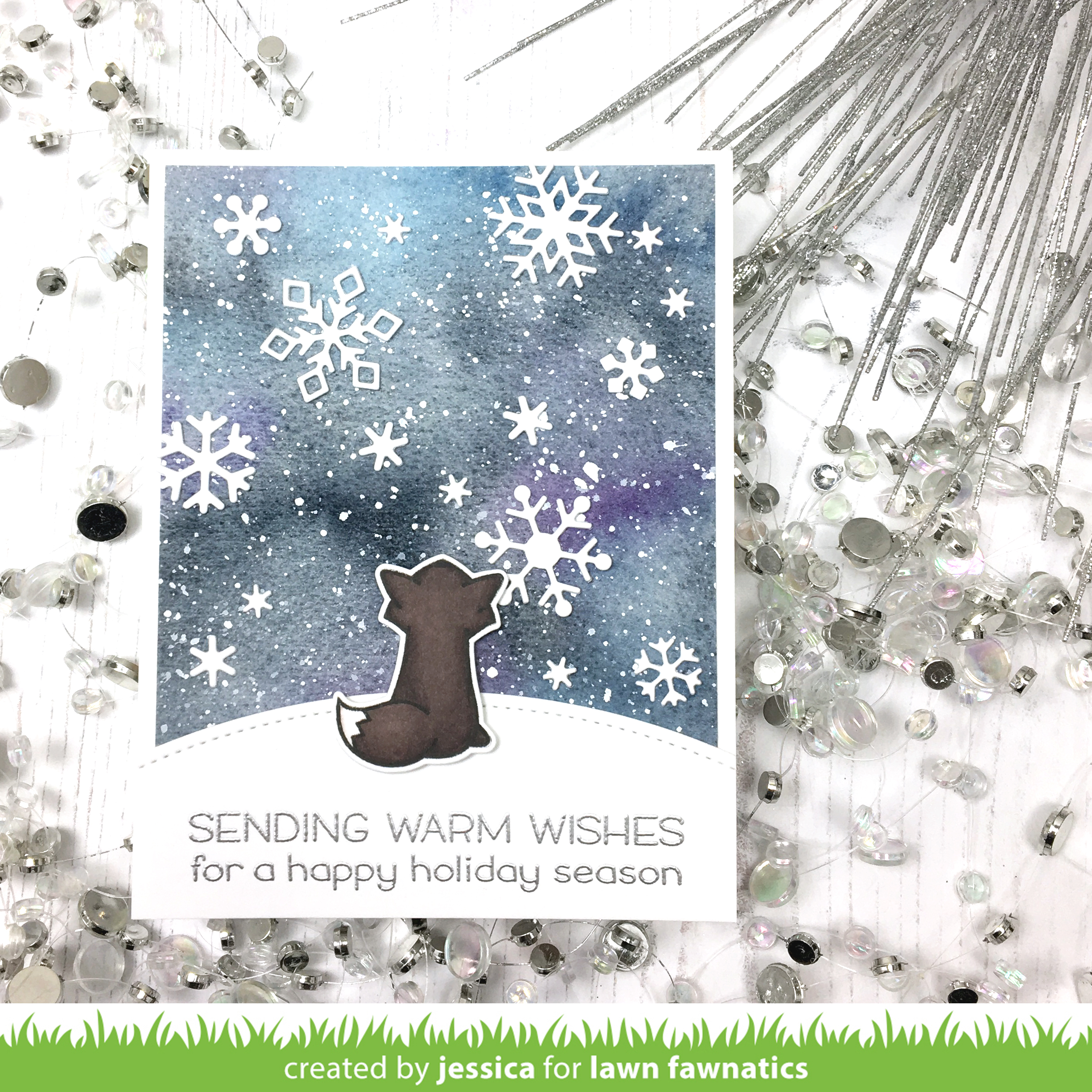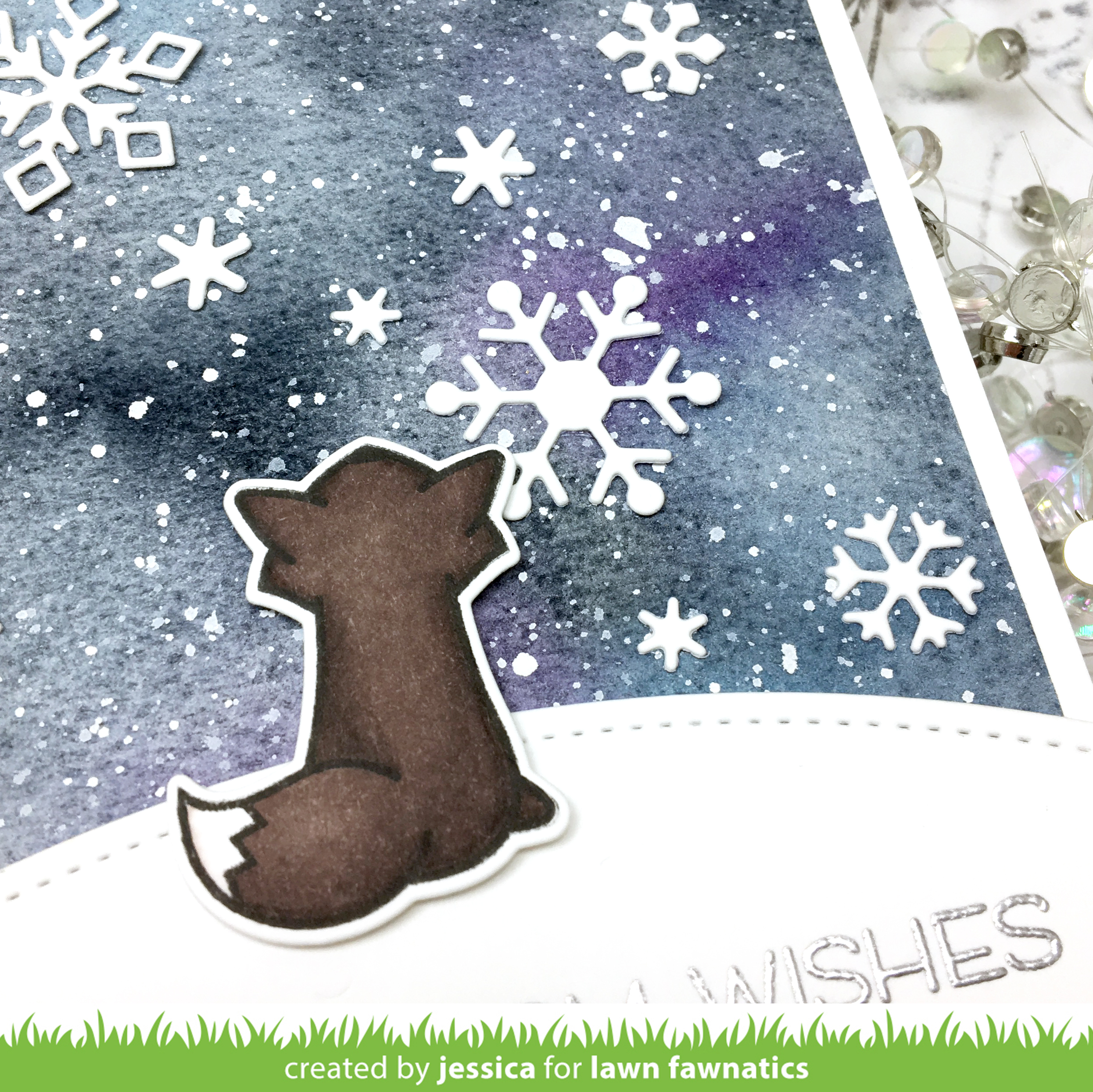 It was incredibly difficult to pick a favorite Lawn Fawn set so I decided to choose from my favorite sets released in 2017 and hands-down one of my favorites was the adorable fox from Upon a Star! I decided to create a fairly CAS card with a watercolored night sky and lots of white die-cutting! I started by stamping my fox and coloring him with copics before die-cutting him with the coordinating die. Then I die-cut the snowy hill from white cardstock, stamped the sentiment, and heat-embossed it with silver embossing powder. I also die-cut the mini snowflakes from white cardstock and set everything aside while I worked on the background.