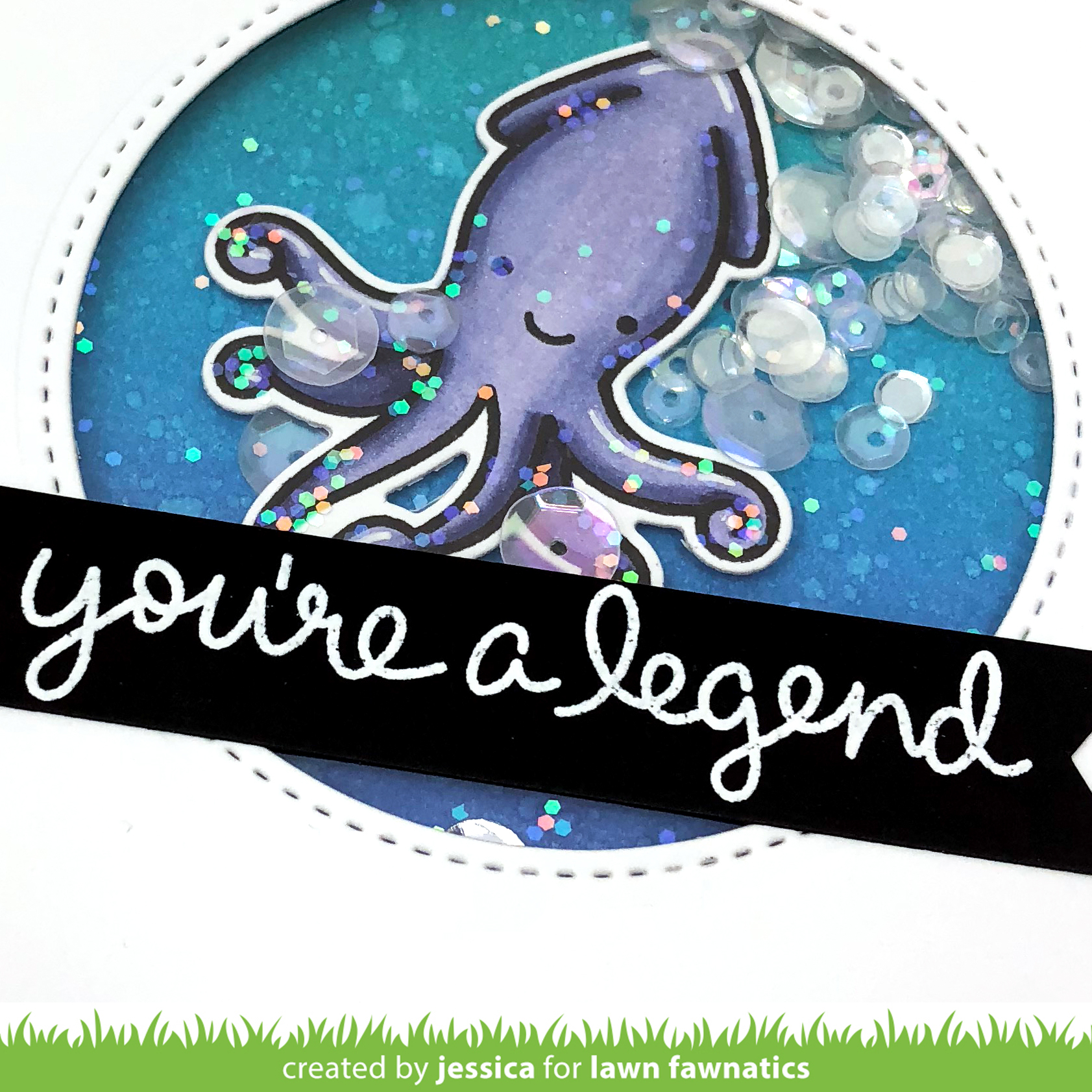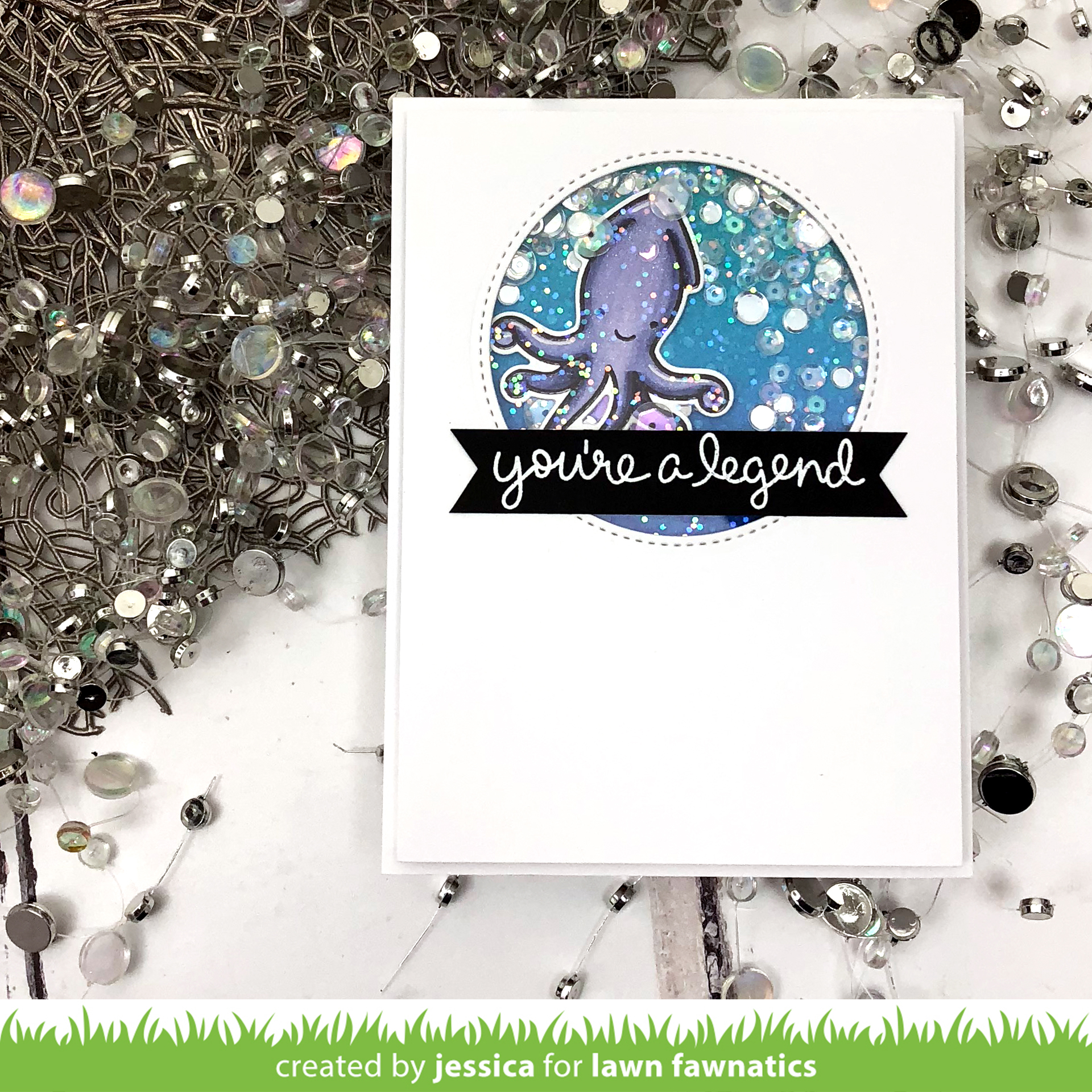 Next I took a stitched circle die and die-cut it with a piece of white cardstock. I adhered acetate to the back and then built up a frame with a double layer of foam mounting tape. I deliberately created a frame much larger than the circle so that the squid can be almost entirely hidden below the circle and can be shaken into view! 😉 I filled the shaker with iridescent clear sequins, clear confetti, and chunky glitter. I closed up the shaker and then added a sentiment heat-embossed on black cardstock!