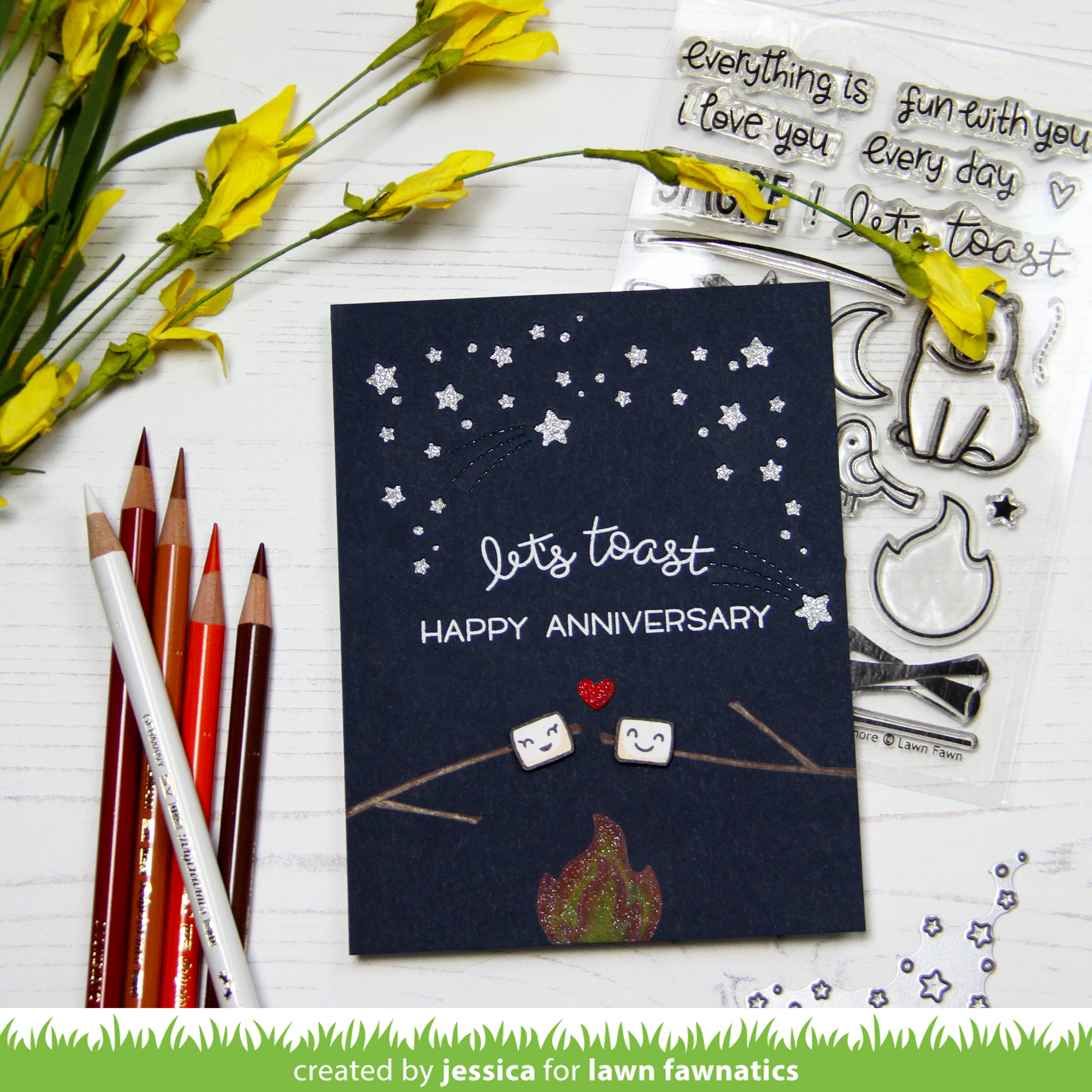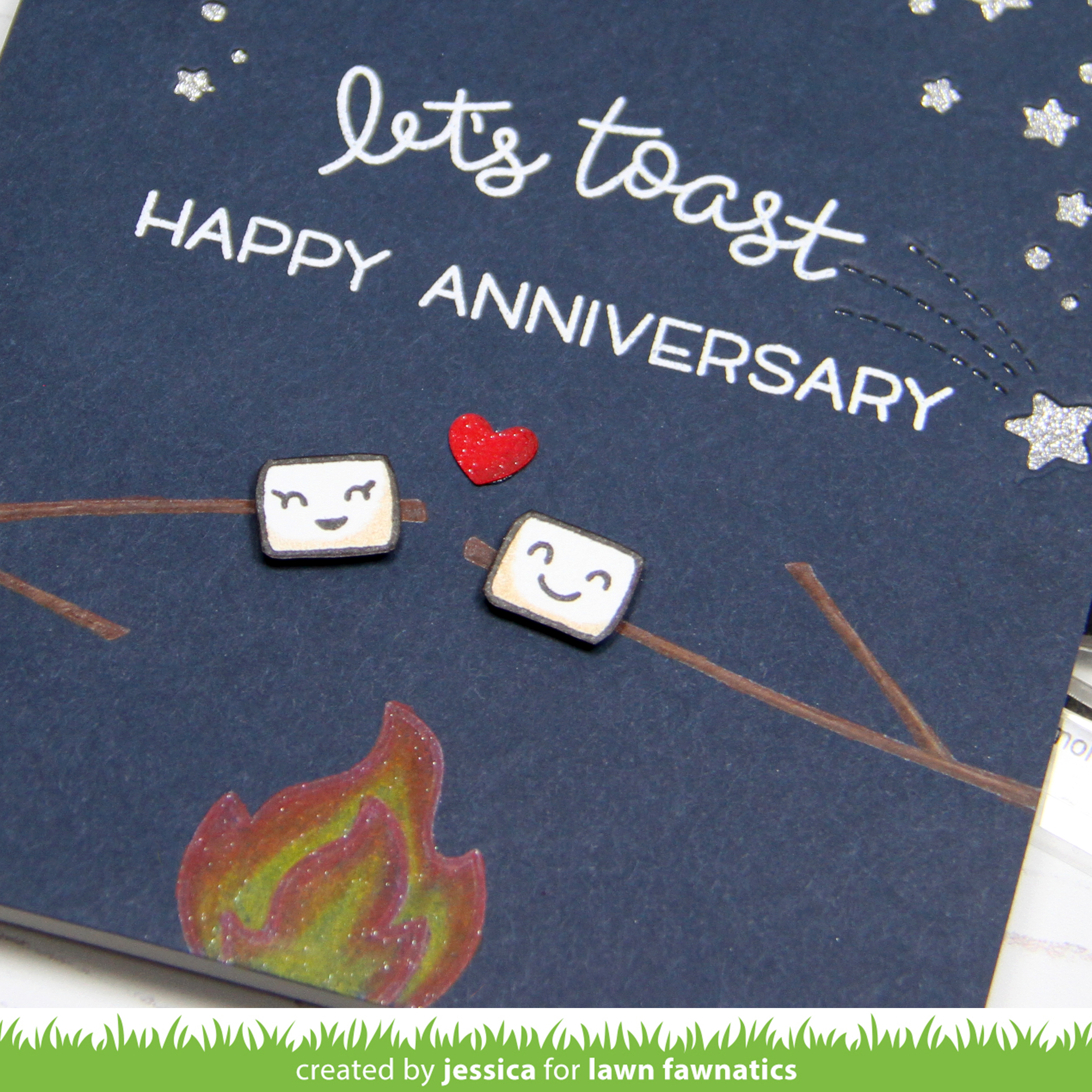 I stamped the sentiment from Love You S’More and Happy Happy Happy with versamark and heat-embossed it with white embossing powder. I stamped the marshmallows on a scrap piece of cardstock and added a little toasty shading with a colored pencil before fussy cutting them and popping them up on my card front with foam mounting tape. Then I die-cut a tiny heart from the Scalloped Box Card Pop-Up die set from red cardstock, added a little shading with a dark red colored pencil, adhered it to my card, and added a little spectrum noir clear sparkle. Finally I backed the stars with silver glitter paper and adhered the panel to a white card base!