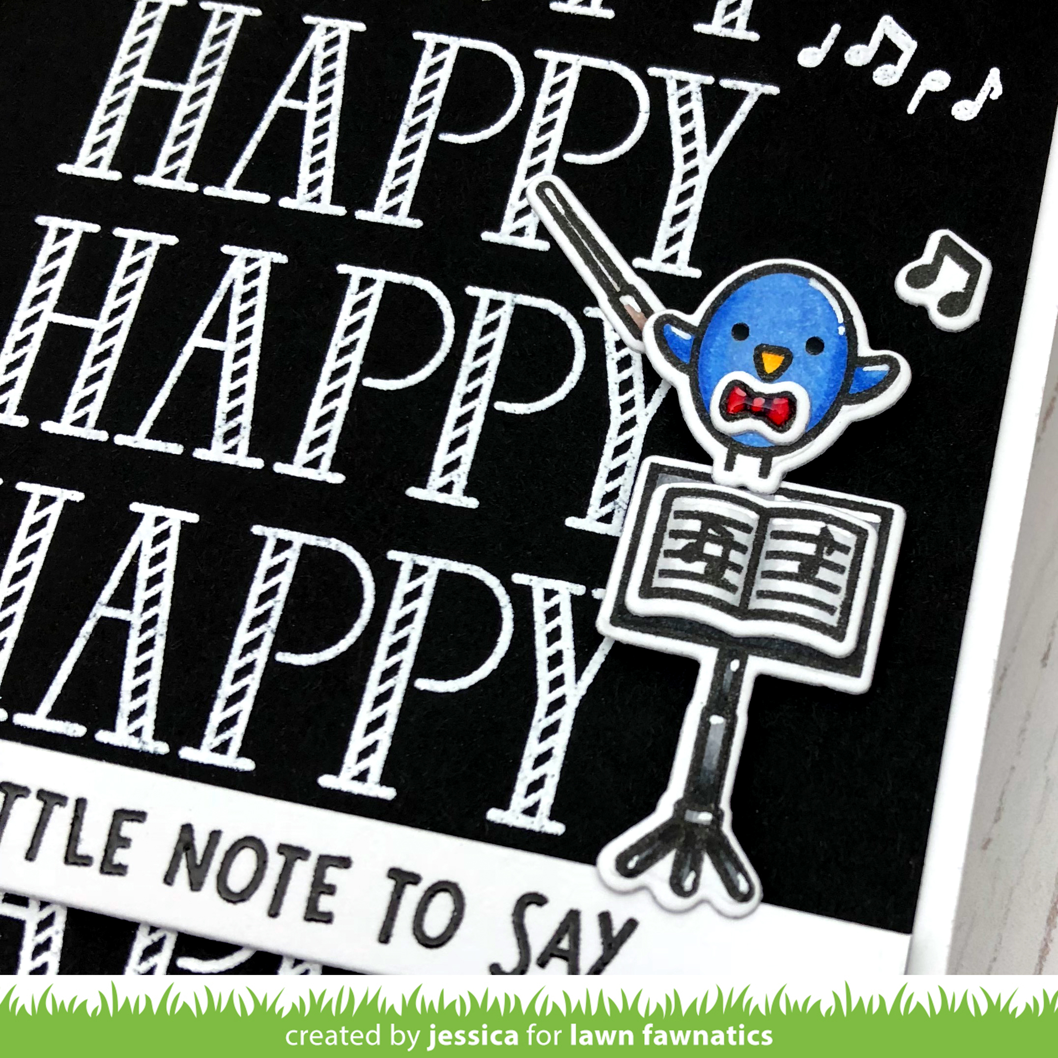 I took a piece of black cardstock and tucked it inside my MISTI. Then I lined up the “Happy” sentiment along the top of the cardstock and stamped it with versamark. I heat-embossed it with white embossing powder and then placed it back inside the MISTI. I moved the panel up slightly then stamped and heat-embossed again. I repeated that until the sentiment was stamped down the entire panel. I also added a few music notes and heat-embossed them. I trimmed that panel down to 4″ by 5.25″ and adhered it to a white card base. On the inside of the card I stamped the sentiment “Happy Birthday To You” from the Critter Concert set. I stamped the rest of the sentiment onto white cardstock with versafine and heat-embossed it with clear embossing powder. I trimmed that down and adhered it to the front of the card with foam mounting tape. Then I added my bird, his music stand, baton, and additional music notes with foam mounting tape. To finish the card I added a little nuvo crystal glaze to his bowtie!