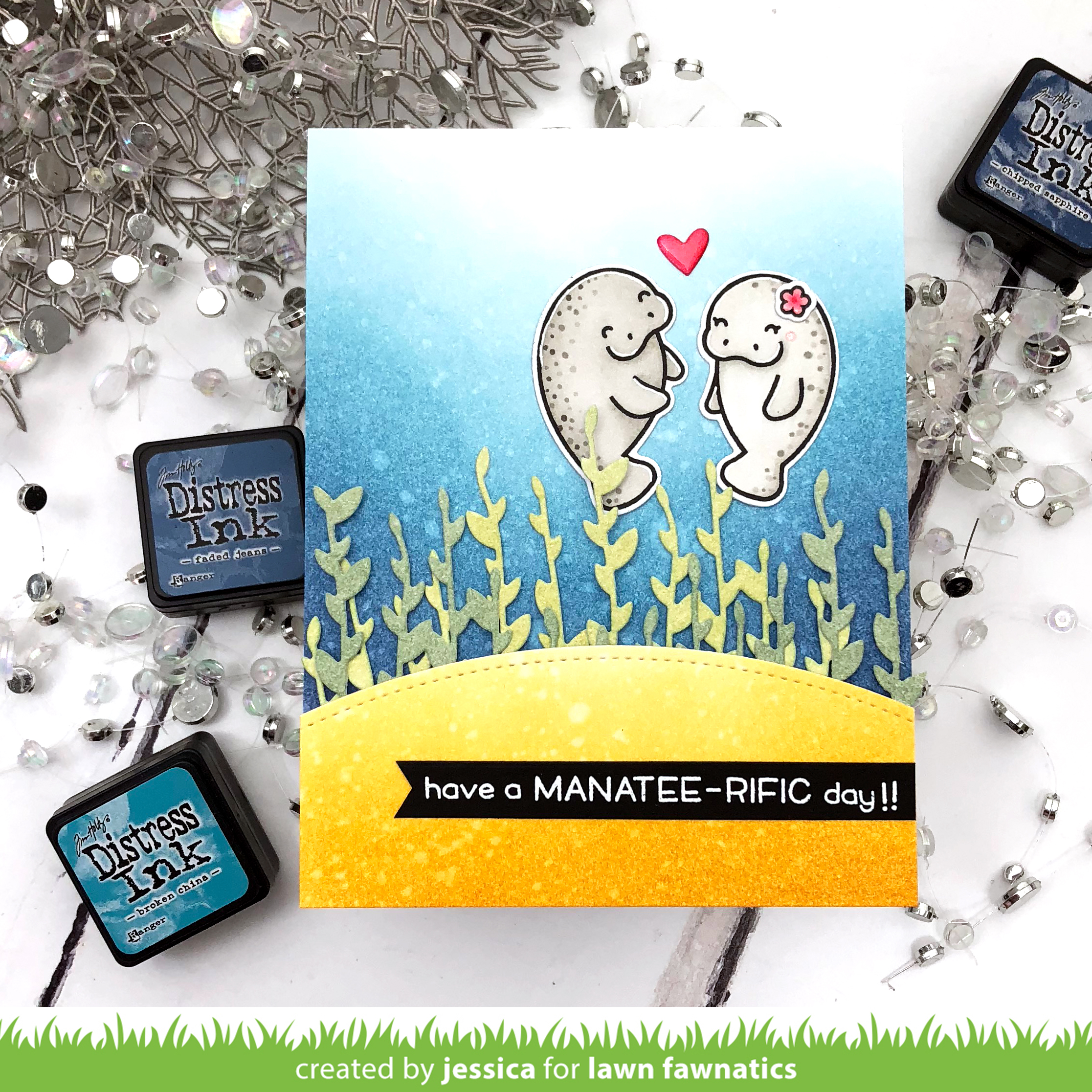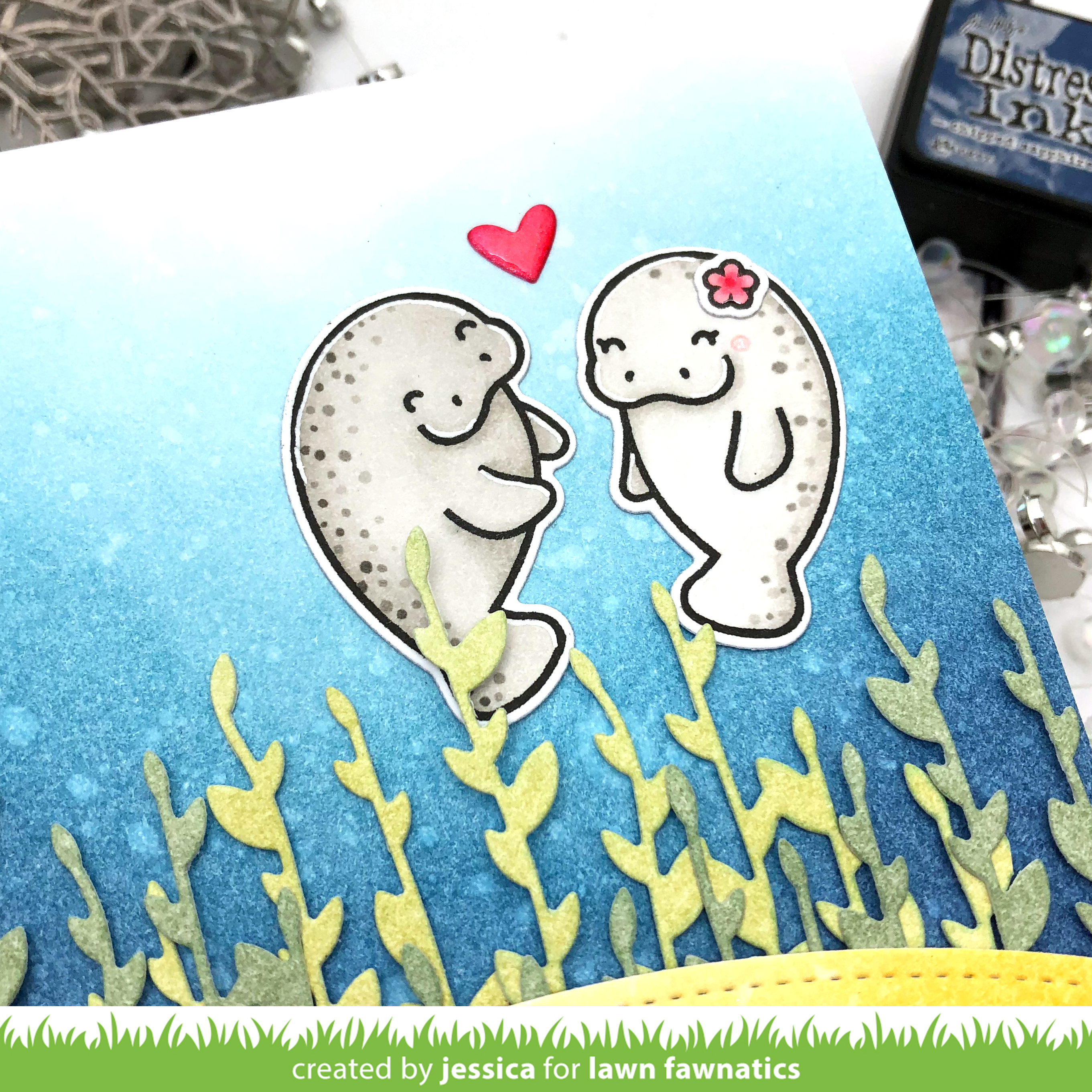 I adhered the ground to the watery background with foam mounting tape. Then I stamped the adorable manatee couple from Manatee-rific and colored them with copic markers before die-cutting them with the coordinating dies. I also die-cut a heart from pink cardstock. I adhered the manatees and the heart to the card panel and added a little spectrum noir clear sparkle and nuvo crystal glaze to the heart. Finally I stamped the sentiment on black cardstock and heat-embossed it with white embossing powder. I trimmed it down to a fishtail banner and adhered it to the card with foam mounting tape.